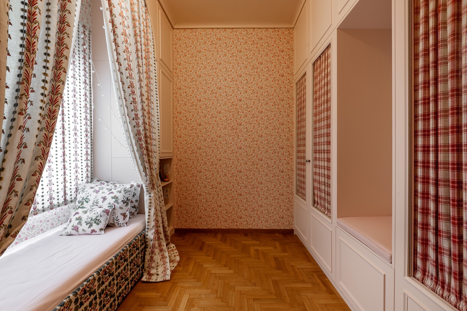 Στην ιδιωτική ζώνη, το παιδικό υπνοδωμάτιο διαμορφώνεται σε παλέτα ροζ αποχρώσεων, ενώ ειδικά σχεδιασμένες κατασκευές ενσωματώνουν το κρεβάτι στην αρχιτεκτονική του χώρου. Αντίστοιχα, το κύριο υπνοδωμάτιο, σε μπλε τόνους, περιλαμβάνει ειδικές κατασκευές που προσθέτουν λειτουργίες και επιλύουν ζητήματα αποθήκευσης.