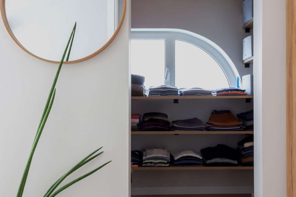 H clutter-free λογική επεκτείνεται στο κρυμμένο εντός του διαδρόμου laundry room και στο walk–in εντός του υπνοδωματίου.