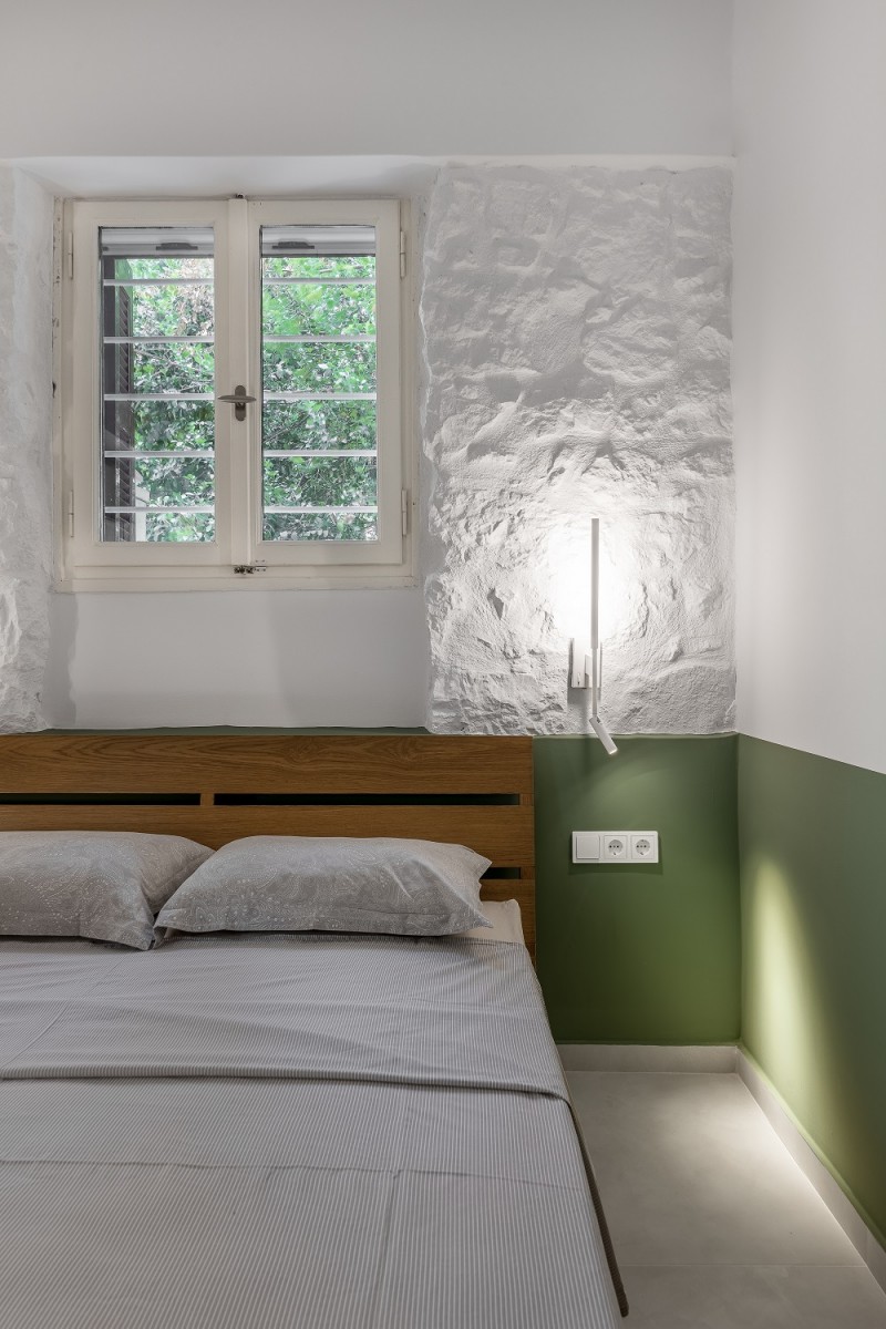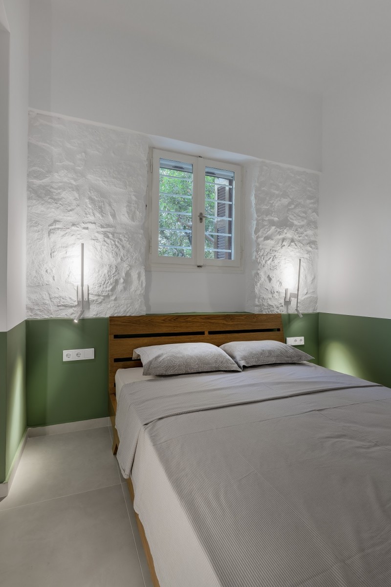Κάθε υπνοδωμάτιο απέκτησε τον δικό του χαρακτήρα. Στο υπνοδωμάτιο των γονιών, που τοποθετήθηκε εκεί όπου στο παρελθόν βρισκόταν η κουζίνα, αποκαλύφθηκε η λιθοδομή του κτηρίου μετά την αφαίρεση των ντουλαπιών και της ορθομαρμάρωσης.