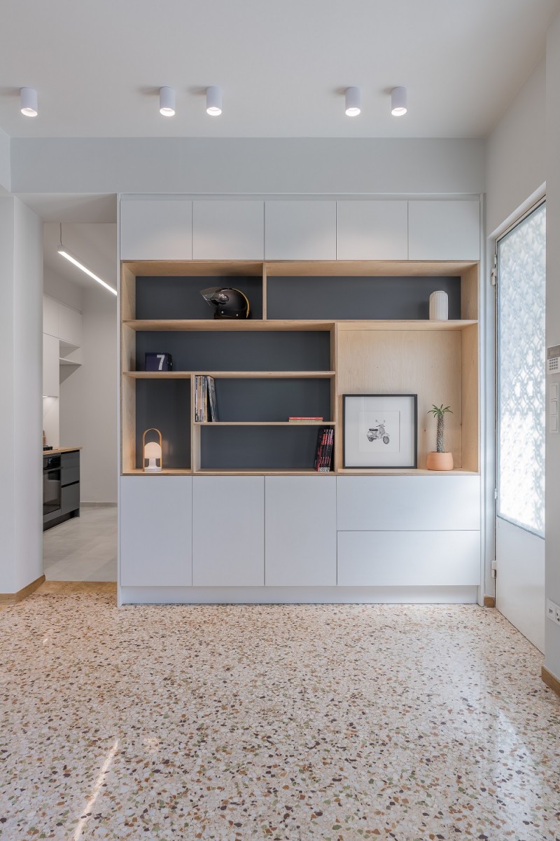 Το διαμέρισμα απέκτησε ενιαίο μορφολογικό χαρακτήρα που καθορίζεται από τη δημιουργία μιας κυρίαρχης ξύλινης σύνθεσης, η οποία προσφέρει λειτουργικότητα, αποθηκευτικούς χώρους και σύγχρονη αισθητική.
