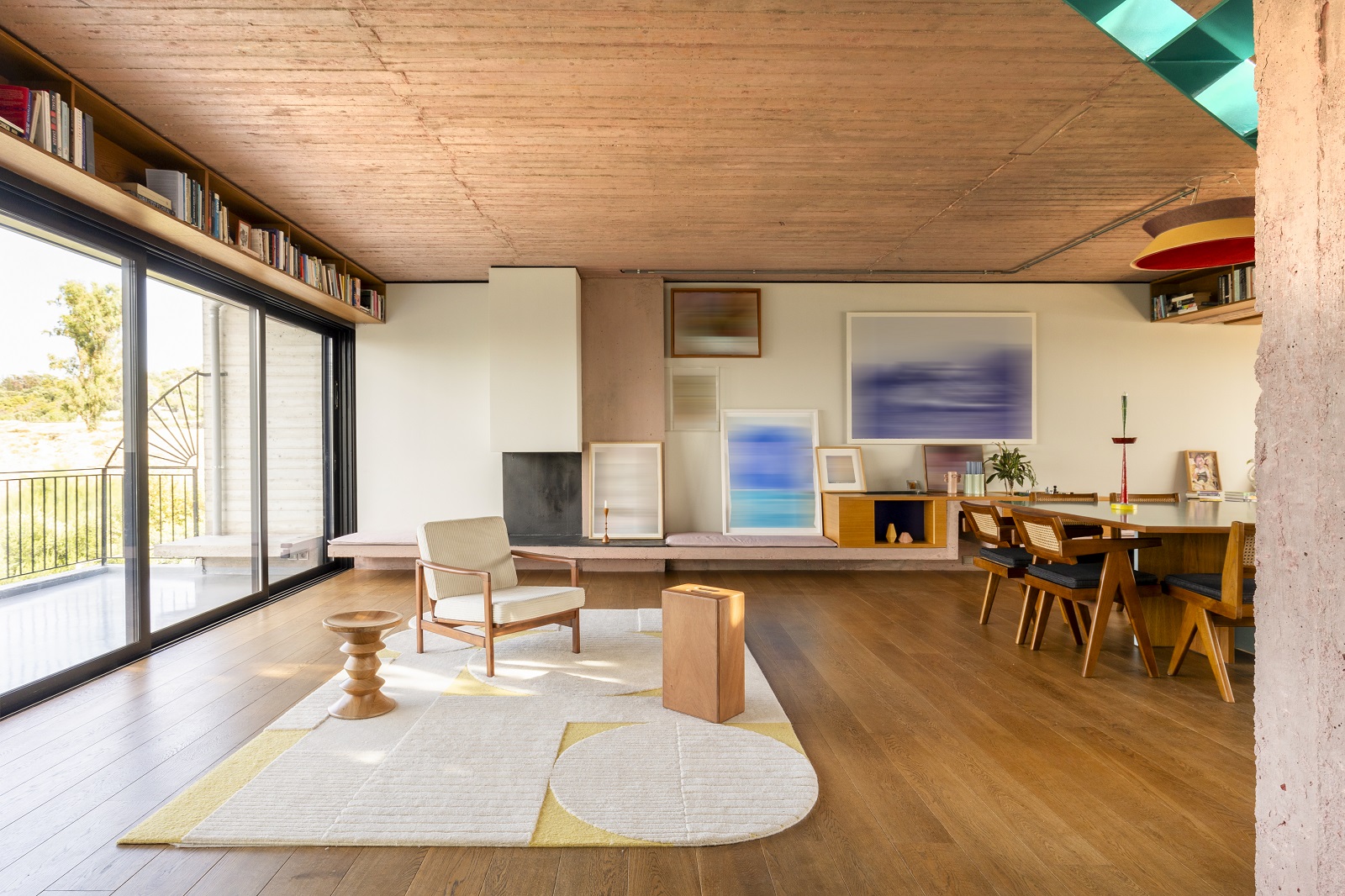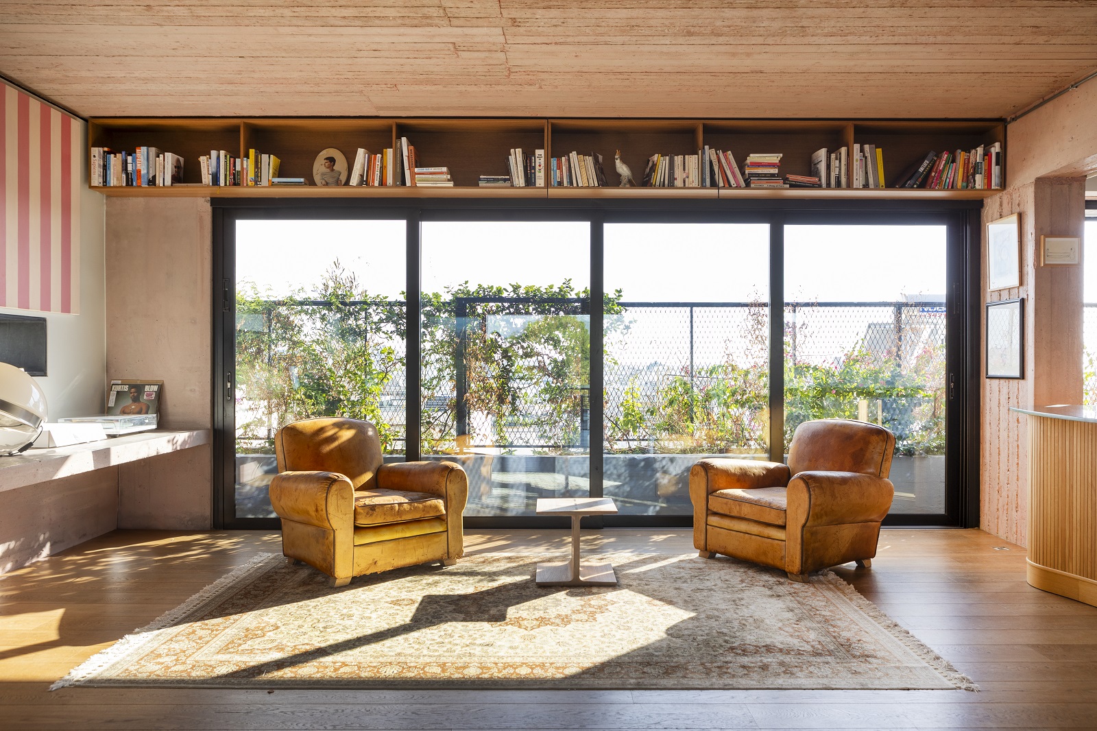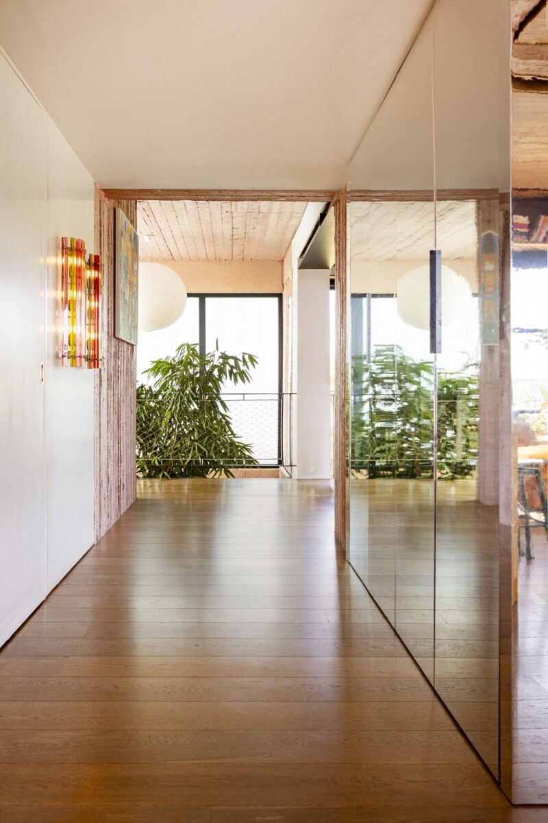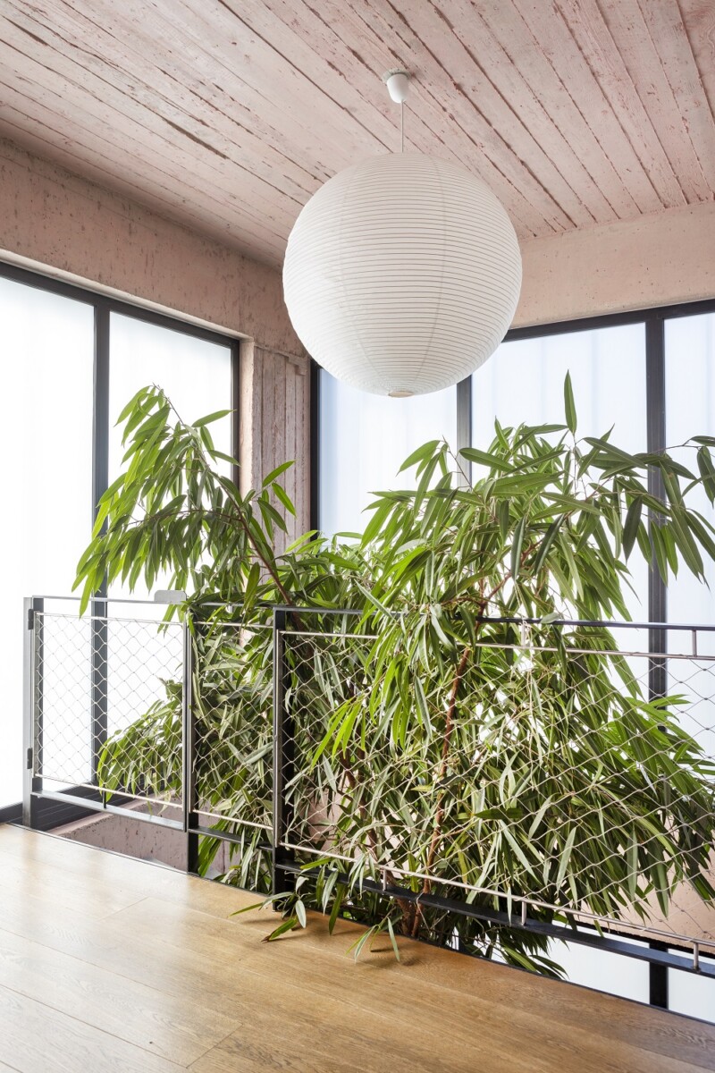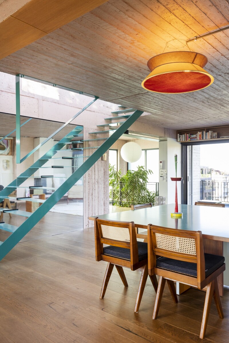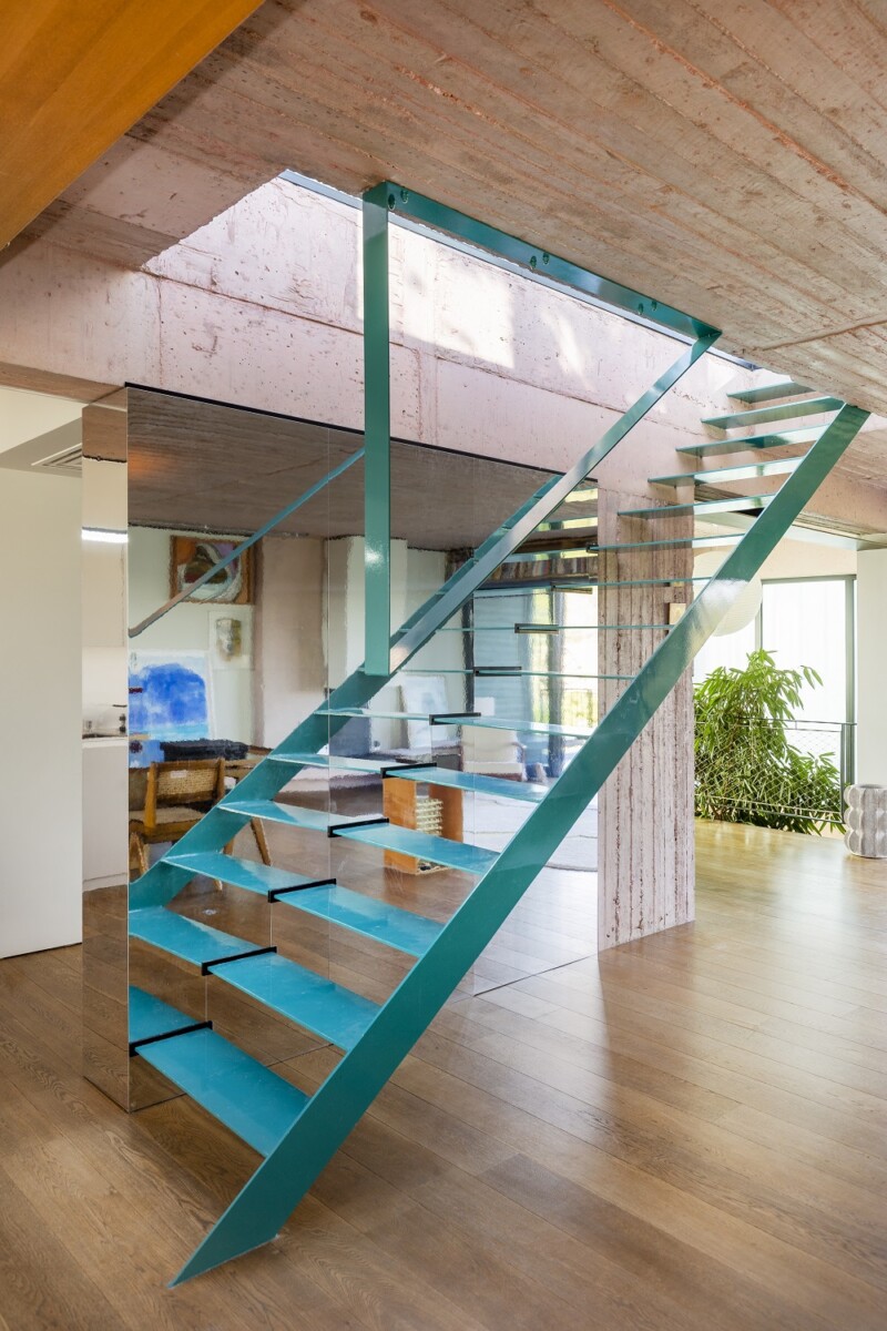 Μια ελικοειδής σκάλα από σκυρόδεμα ενώνει εσωτερικά τους δύο ορόφους, ενώ μια μεταλλική σκάλα που μοιάζει να αιωρείται συνδέει τους κοινόχρηστούς χώρους με τον κήπο του δώματος.