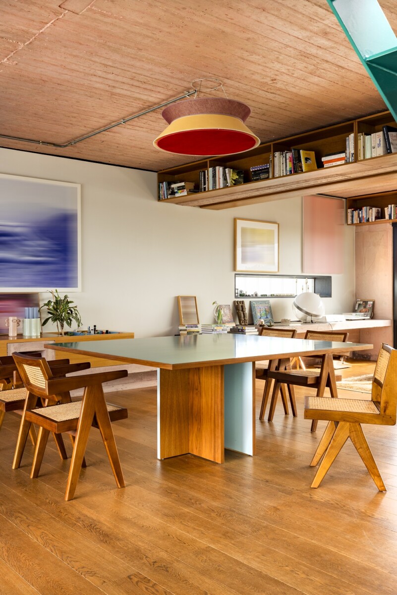 Το τραπέζι της τραπεζαρίας επίσης, αποτελείται από ξύλινες επιφάνειες με γαλάζια σόκορα και ένα δίχρωμο υφασμάτινο φωτιστικό οροφής που μοιάζει σαν υπερμεγέθες αμπαζούρ.