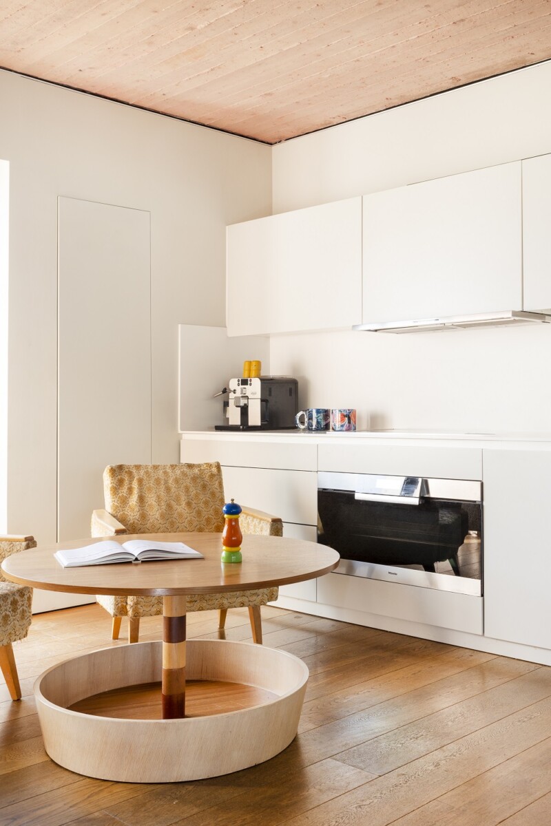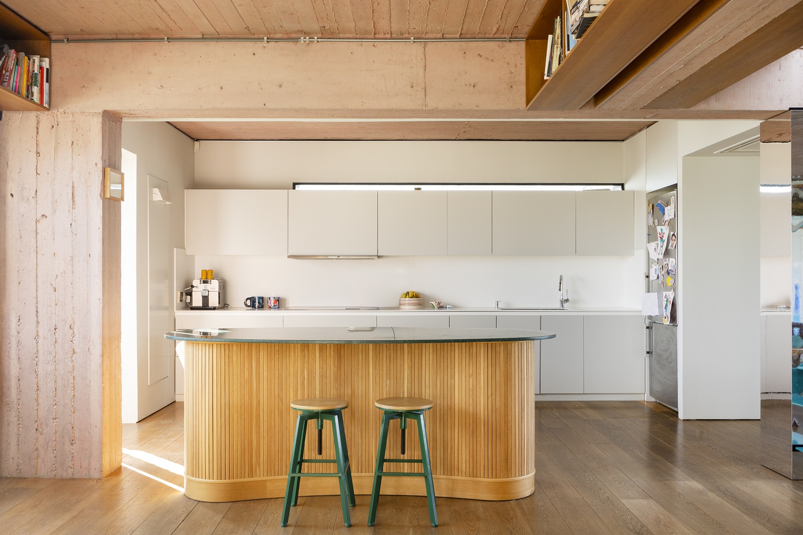 Το custom made κυκλικό τραπέζι στην κουζίνα, από διαφορετικά ξύλα σχεδιάστηκε με έναν μικρό ενσωματωμένο κάδο αποθήκευσης για τα παιχνίδια των παιδιών.