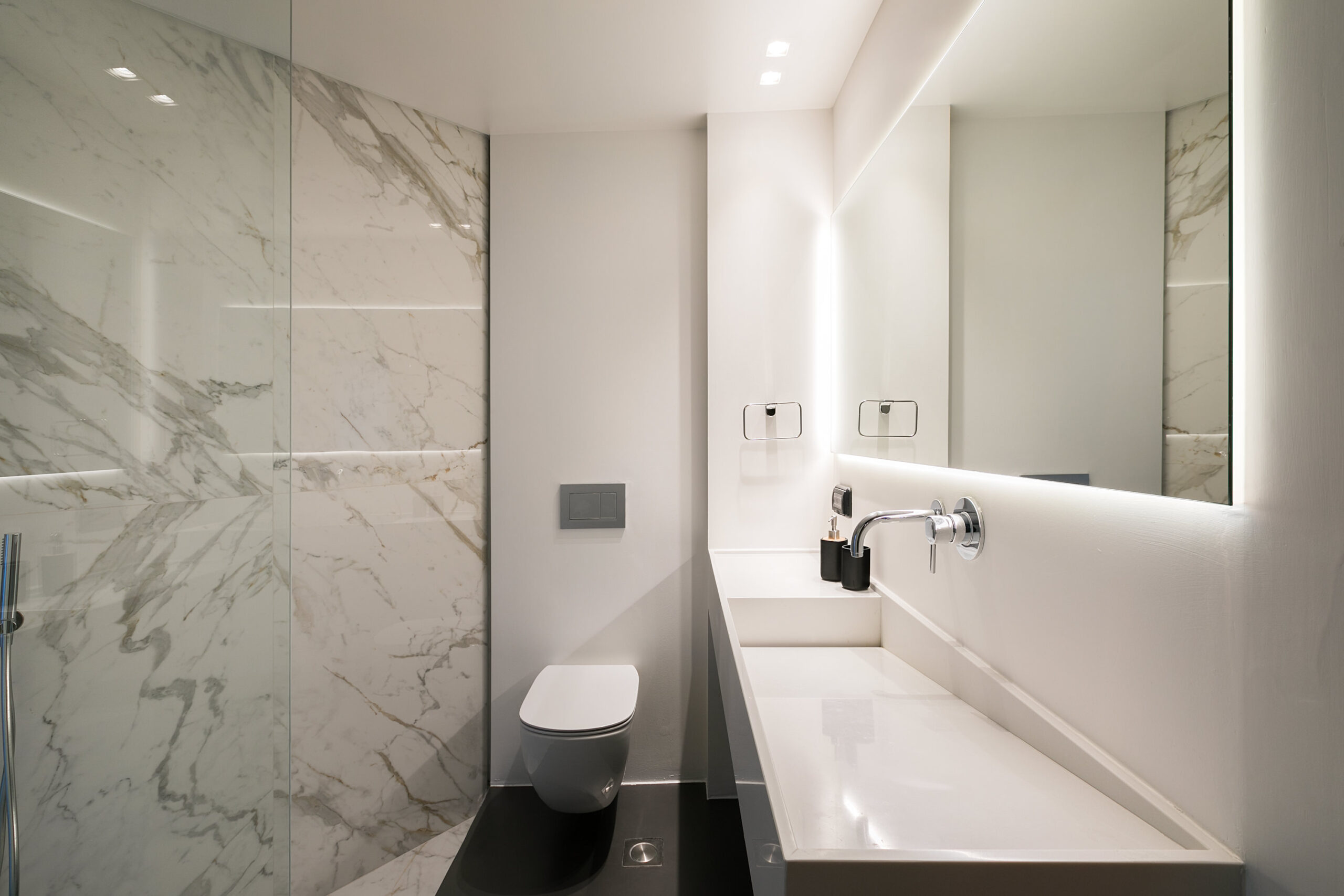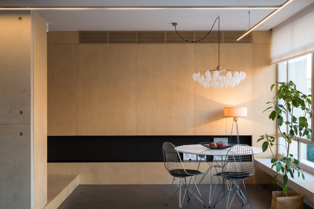 Ως ένδειξη της οργάνωσης των λειτουργιών στην κάτοψη, κατασκευάσθηκε το κεντρικό φωτιστικό που διατρέχει την οροφή του διαμερίσματος.