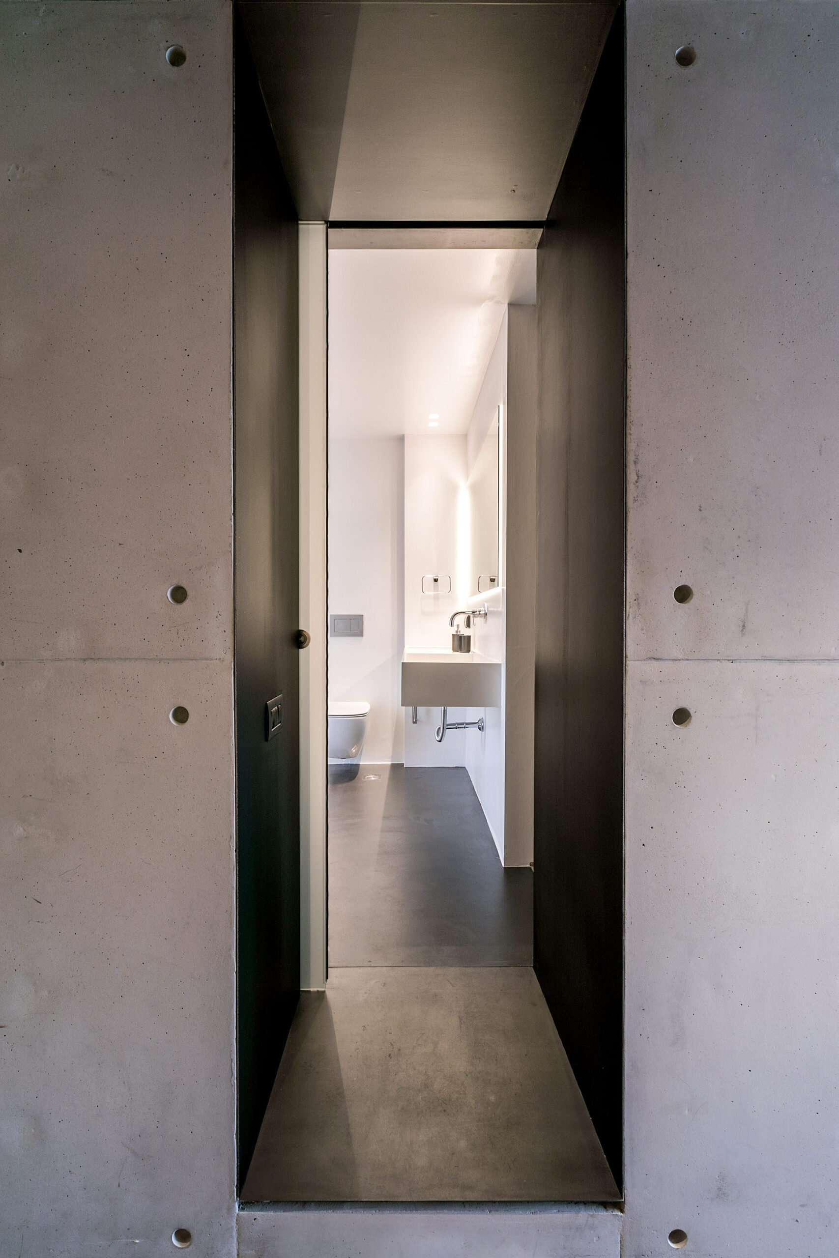 Ο γραμμικός τοίχος από εμφανές σκυρόδεμα υλοποιείται πάνω στον βασικό άξονα της εισόδου και οδηγεί στον πυρήνα της κατοικίας, συναντώντας εγκάρσια την ζώνη των χώρων διημέρευσης.