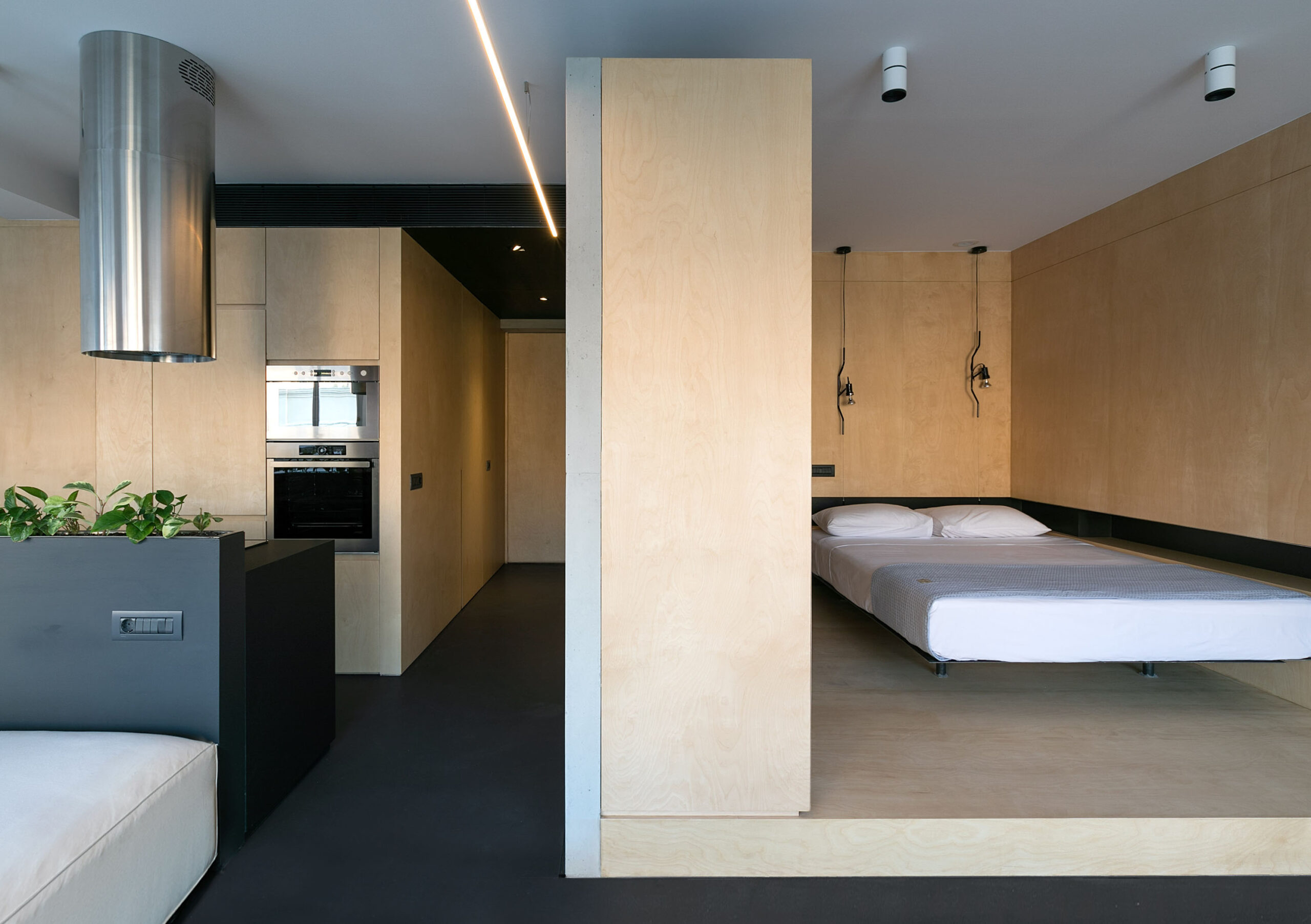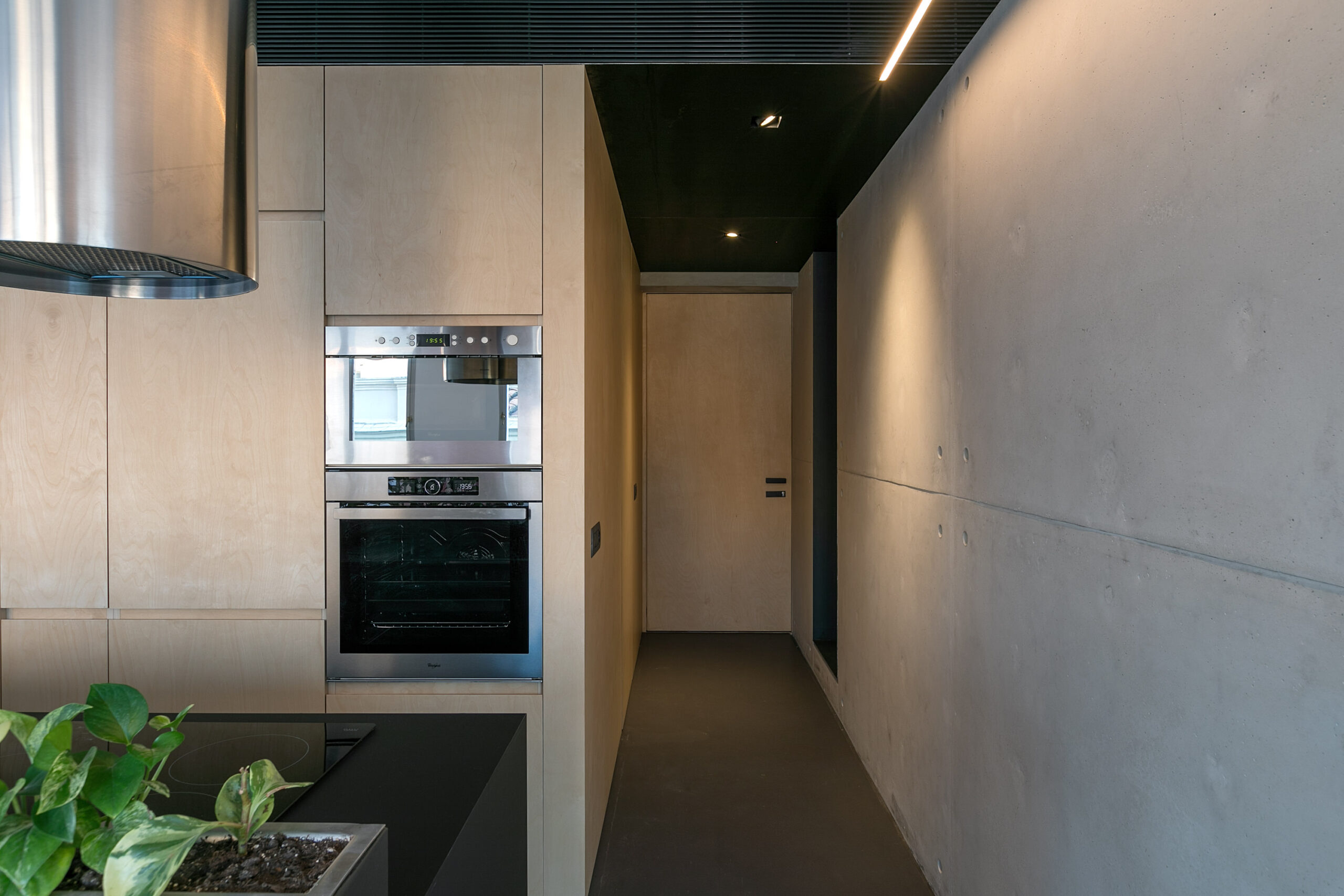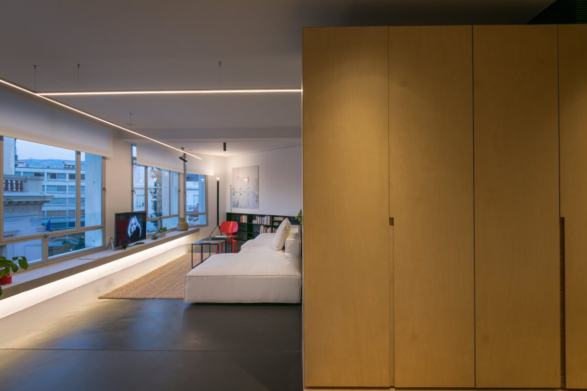 Η παράλληλη διάταξη όλων των λειτουργιών ως προς την όψη (κουζίνα, χώρος αποθήκευσης, λουτρό, υπνοδωμάτιο), αφήνει ελεύθερη τη ζώνη των χώρων διημέρευσης (καθιστικό, χώρος εργασίας-φαγητού), δημιουργώντας οπτικές φυγές και θεάσεις προς την πόλη, σχεδόν από όλους τους χώρους της κατοικίας.