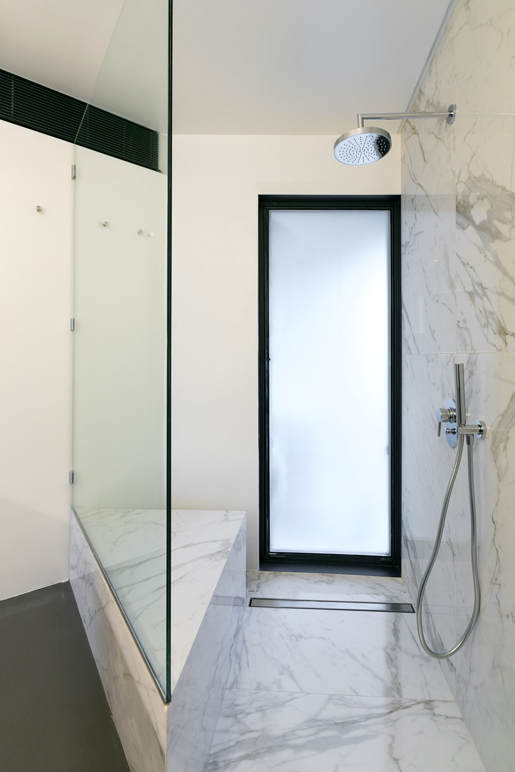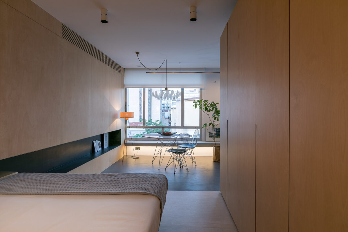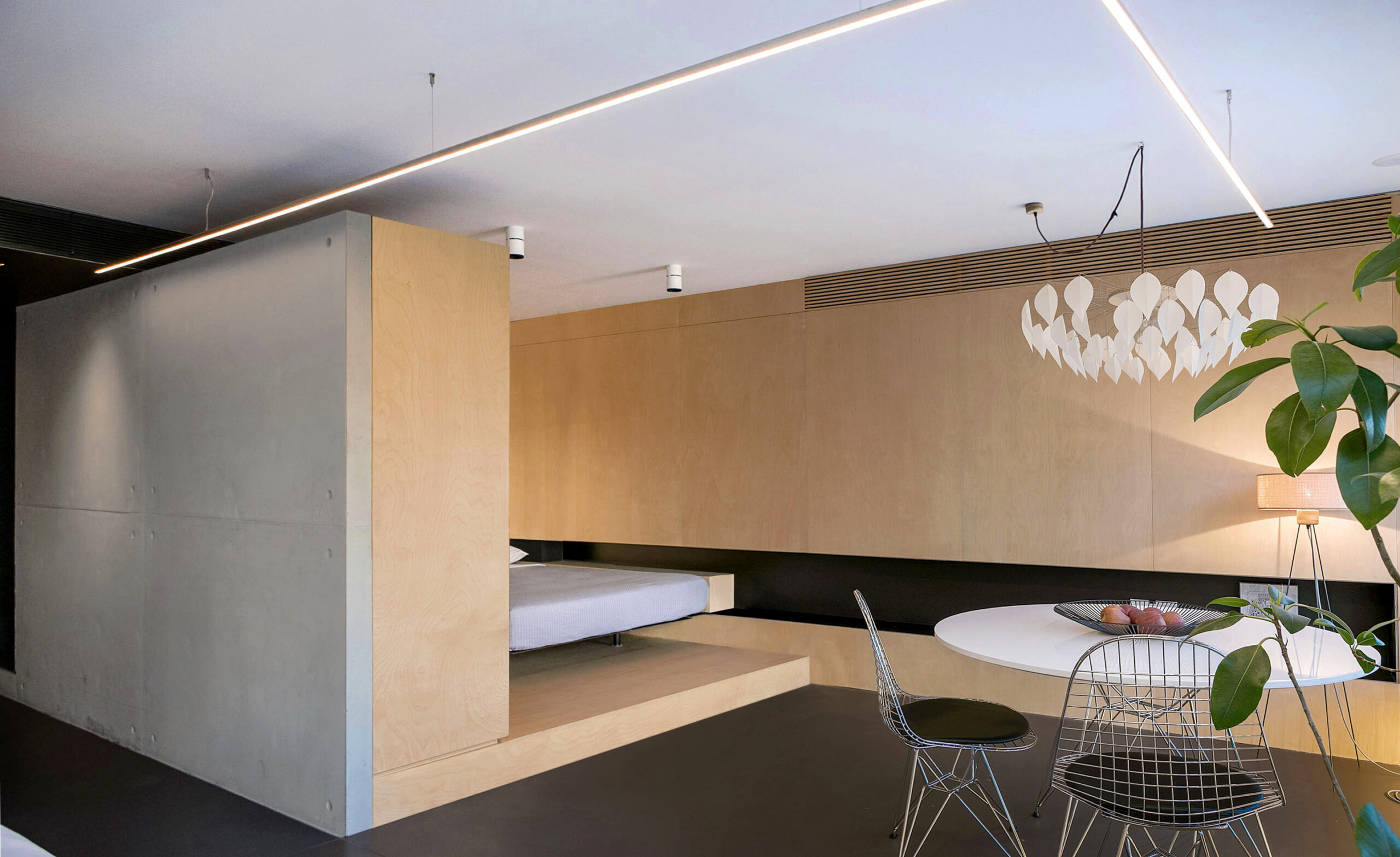 Η παράλληλη διάταξη όλων των λειτουργιών ως προς την όψη (κουζίνα, χώρος αποθήκευσης, λουτρό, υπνοδωμάτιο), αφήνει ελεύθερη τη ζώνη των χώρων διημέρευσης (καθιστικό, χώρος εργασίας-φαγητού), δημιουργώντας οπτικές φυγές και θεάσεις προς την πόλη, σχεδόν από όλους τους χώρους της κατοικίας.