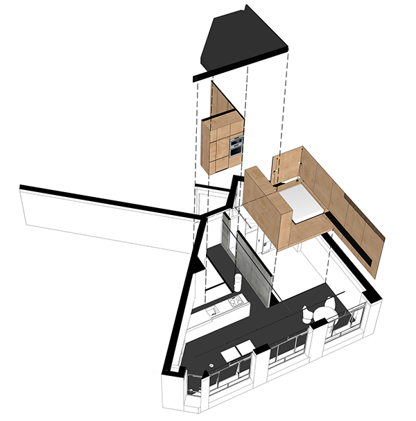 Συμπληρωματικά του στοιχείου του τοίχου, αρθρώνονται το τριγωνικό ξύλινο πρίσμα των λειτουργιών της κουζίνας και του αποθηκευτικού χώρου, καθώς και του ξύλινου επίσης στοιχείου σχήματος U, που εσωκλείει τον χώρο του ύπνου.