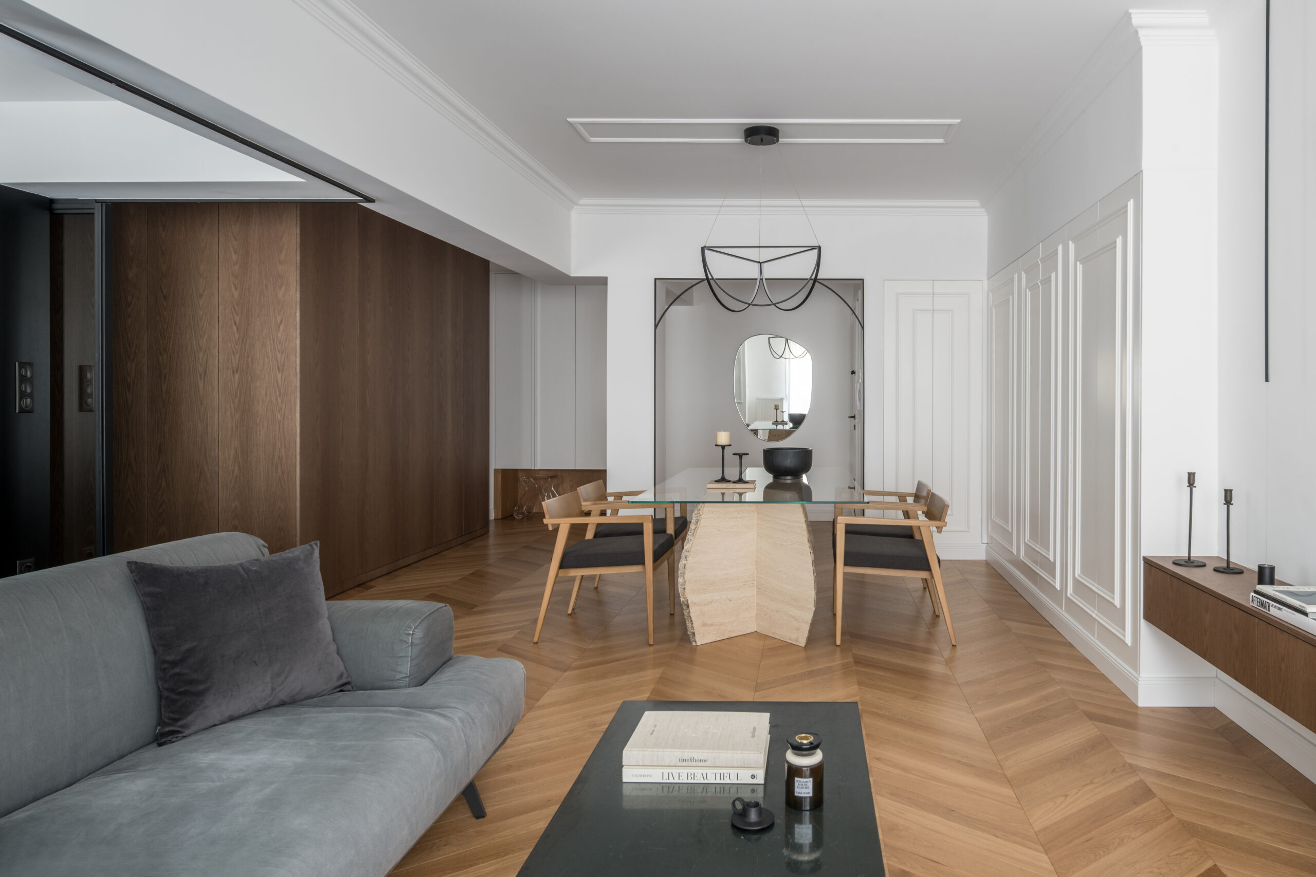 Πρόθεση του αρχιτεκτονικού γραφείου ήταν να προκύψουν χώροι με καθαρές γραμμές και γήινα χρώματα, δημιουργώντας μια ατμόσφαιρα ηρεμίας. Τα έντονα διακοσμητικά τελειώματα των οροφών, καθώς και ο συνδυασμός λακαριστών ταμπλαδωτών επιφανειών και δρύινων σκουρόχρωμων ξυλεπενδύσεων, προσδίδουν μια αίσθηση διαχρονικής πολυτέλειας στο διαμέρισμα, διατηρώντας όμως ταυτόχρονα μια minimal αισθητική.