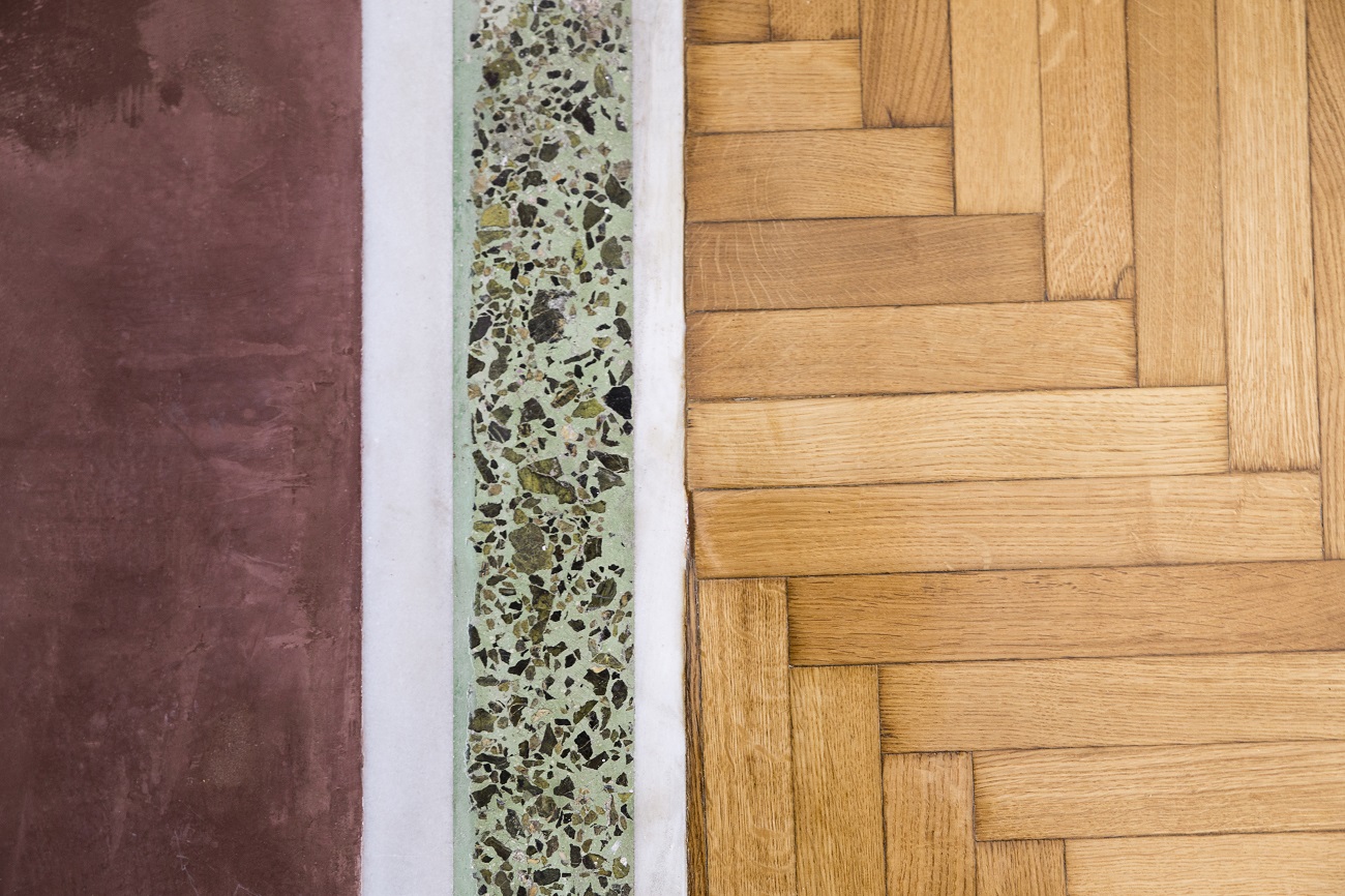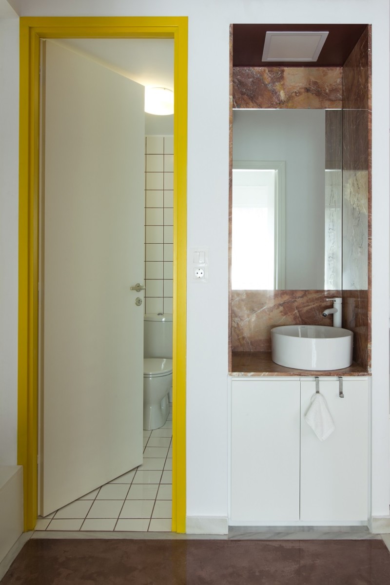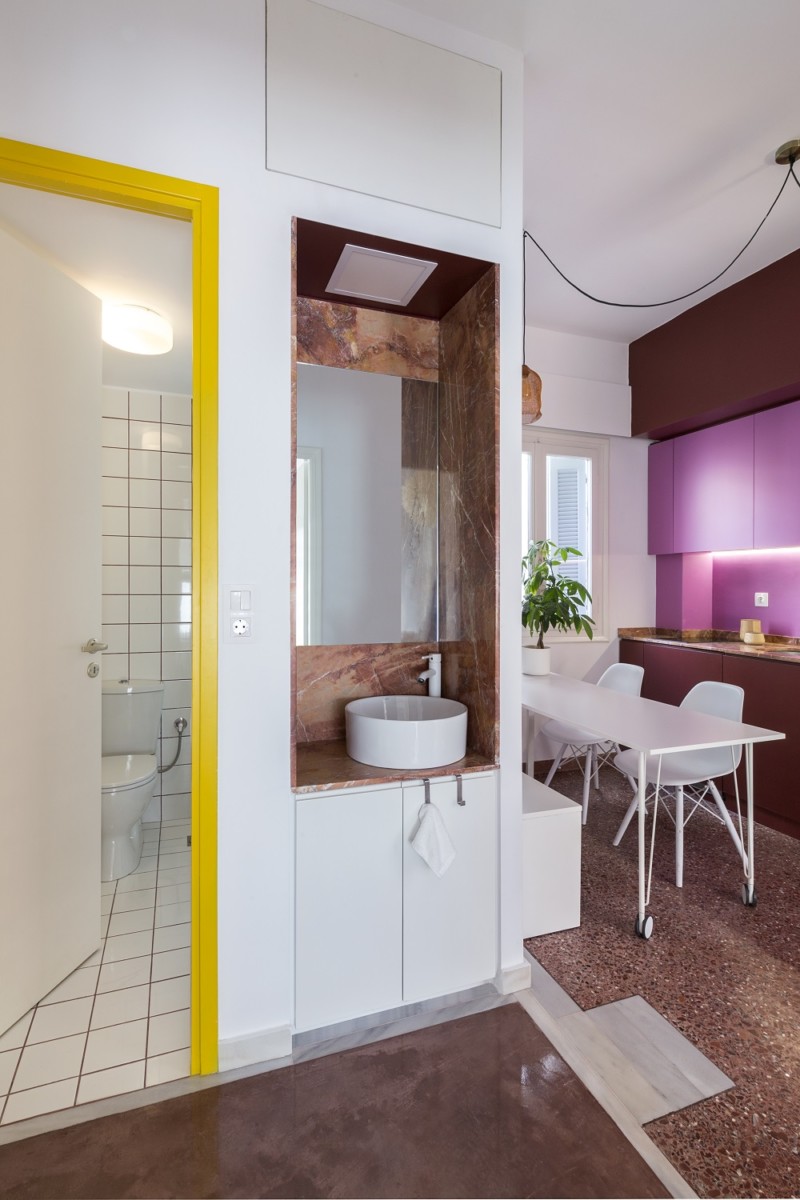 Το μπορντό χρώμα προήλθε από το μωσαϊκό δάπεδο, το οποίο συντηρήθηκε και συμπληρώθηκε σαν κέντημα, με γεμίσματα μαρμάρου και χρωματισμένου τσιμέντου. Το ροζ ακούμπησε κάποιες επιφάνειες και στα πόμολα των ντουλαπών, και τέλος το κίτρινο περιέγραψε τις κάσες των πορτών.