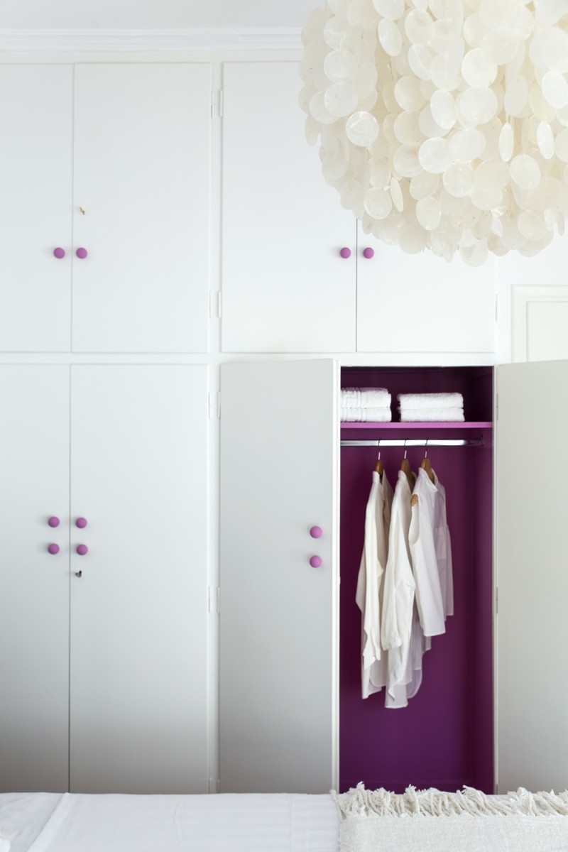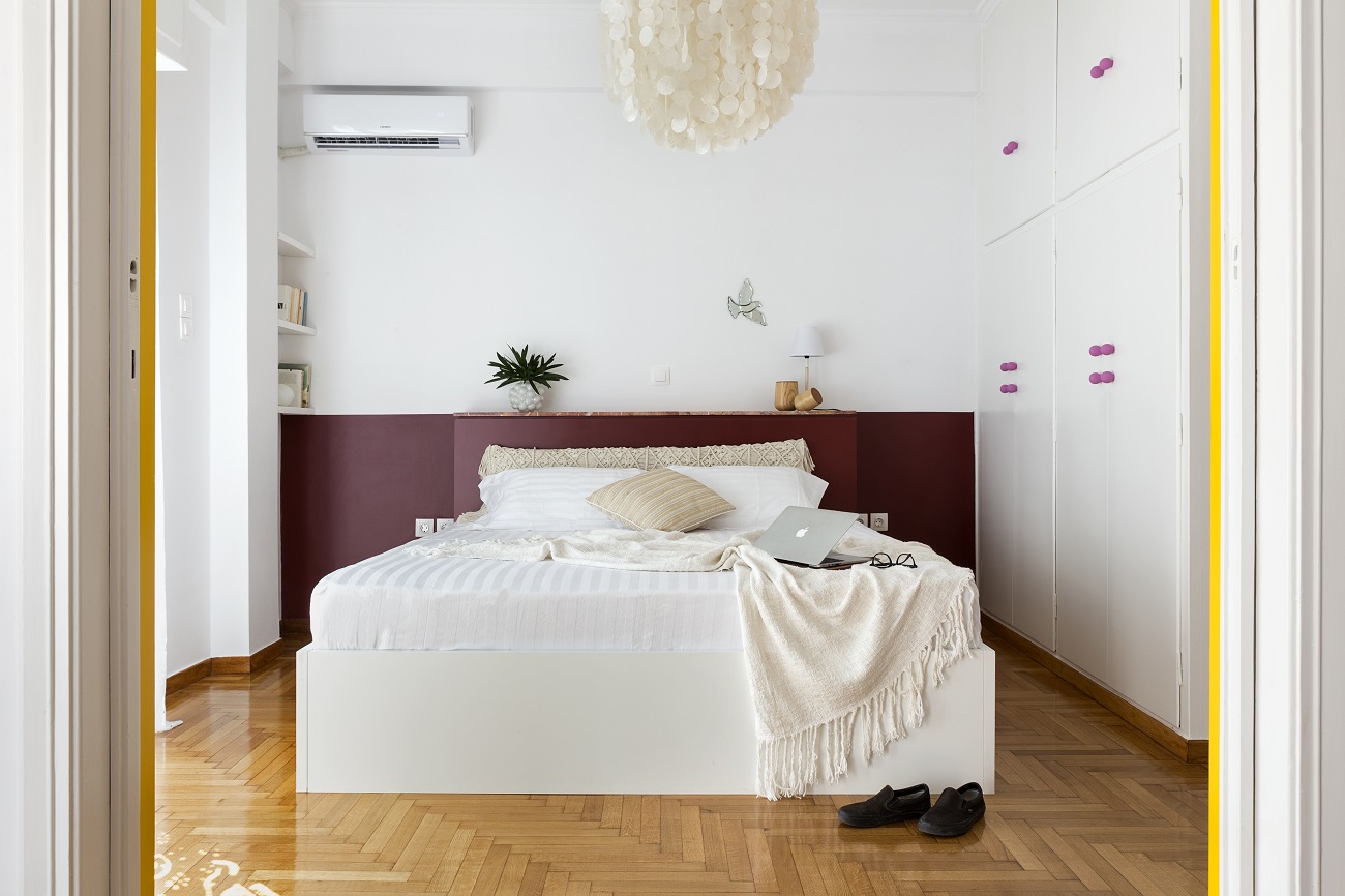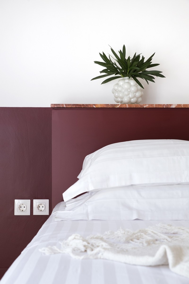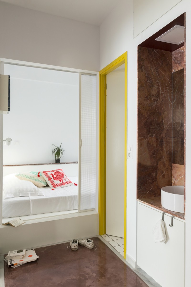 Το μπορντό χρώμα προήλθε από το μωσαϊκό δάπεδο, το οποίο συντηρήθηκε και συμπληρώθηκε σαν κέντημα, με γεμίσματα μαρμάρου και χρωματισμένου τσιμέντου. Το ροζ ακούμπησε κάποιες επιφάνειες και στα πόμολα των ντουλαπών, και τέλος το κίτρινο περιέγραψε τις κάσες των πορτών.