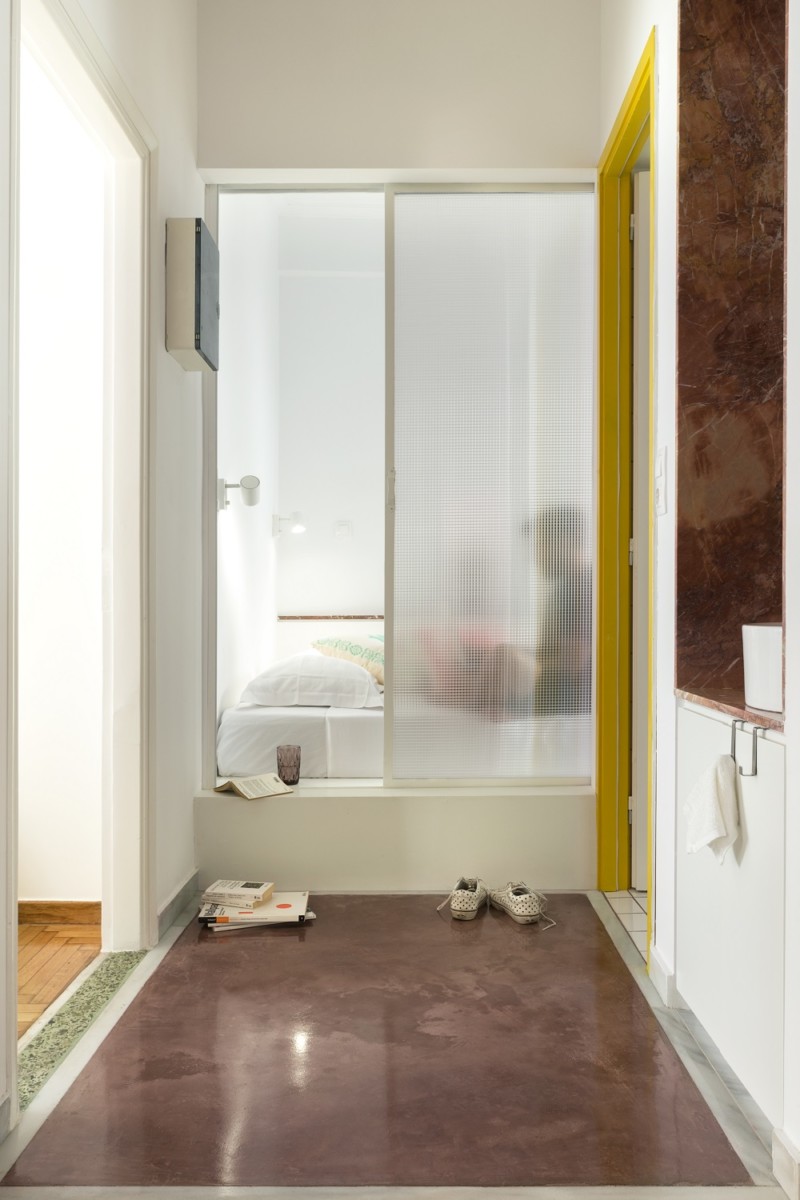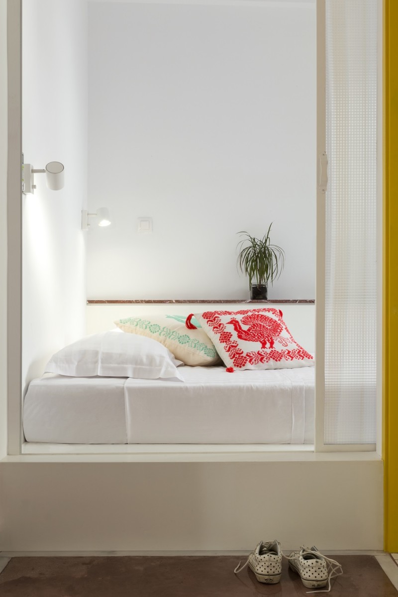 Το βοηθητικό υπνοδωμάτιο, ιδιαίτερα μικρό, ανασηκώθηκε ολόκληρο σε ξύλινη πλατφόρμα με διπλό κρεβάτι που ανάλογα με τις ανάγκες γίνεται και καθιστικός χώρος με μαξιλάρια.