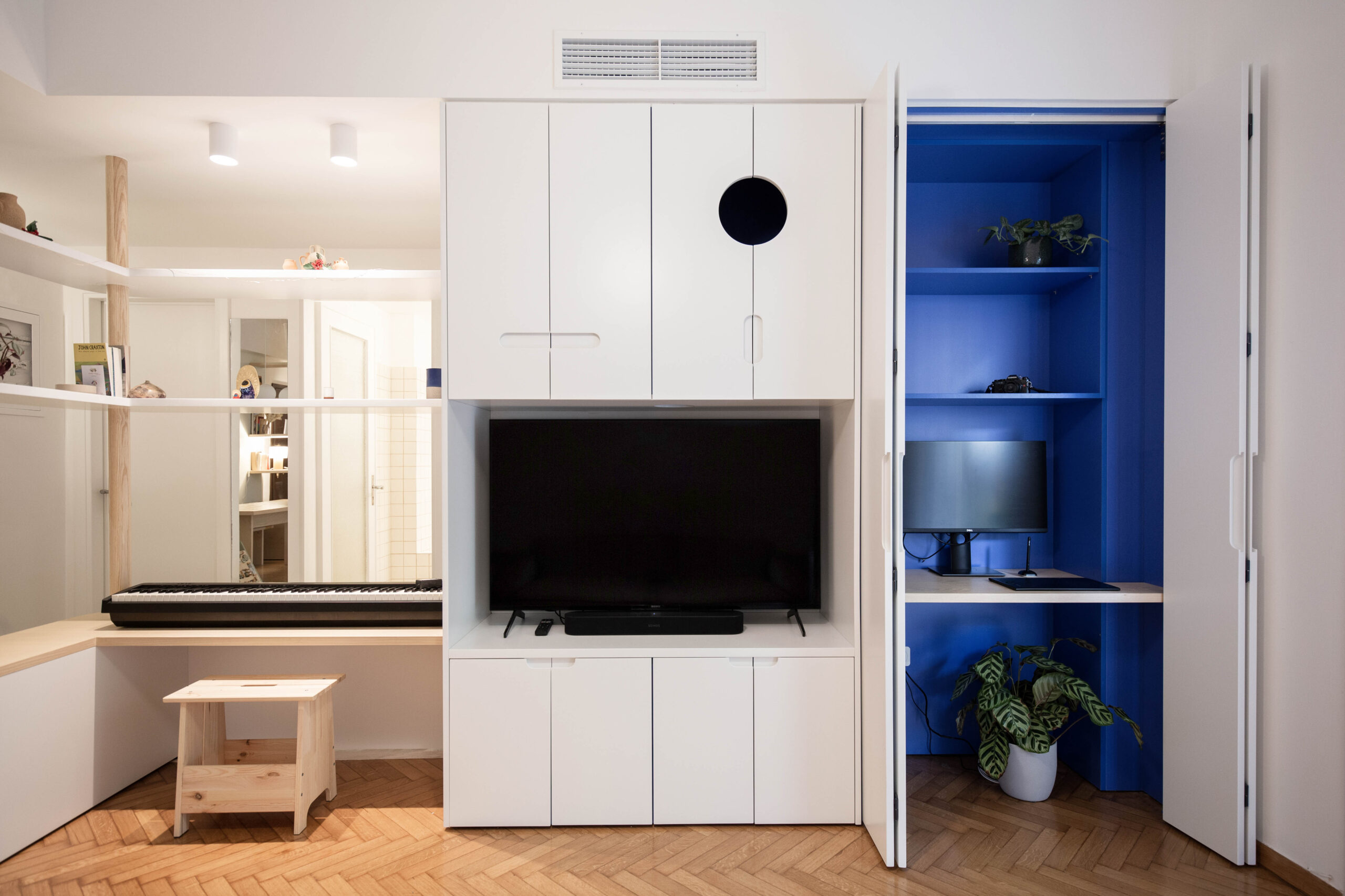 Στη θέση των διαχωριστικών τοίχων που υπήρχαν, δημιουργήθηκαν μια σειρά από πρακτικά, «κατοικήσιμα» ξύλινα έπιπλα, τα οποία εξυπηρετούν ποικίλλες δραστηριότητες και λύσεις αποθήκευσης.