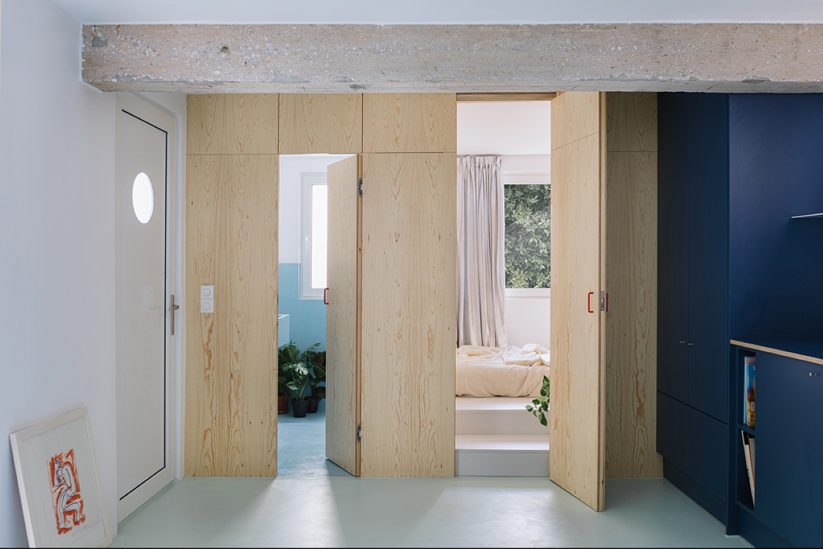 Ο νέος ξύλινος τοίχος που δημιουργήθηκε, χωρίζει το σαλόνι από τους δύο μικρότερους ιδιωτικούς χώρους. Στην εντοιχισμένη κρεβατοκάμαρα που έχει διαμορφωθεί, μια ξύλινη πλατφόρμα ανυψώνει το κρεβάτι για να συγκροτήσει μια αίσθηση περίφραξης, επιτρέποντας παράλληλα την τοποθέτηση συρταριών και ενός κρυφού αποθηκευτικού χώρου κάτω από το κρεβάτι.