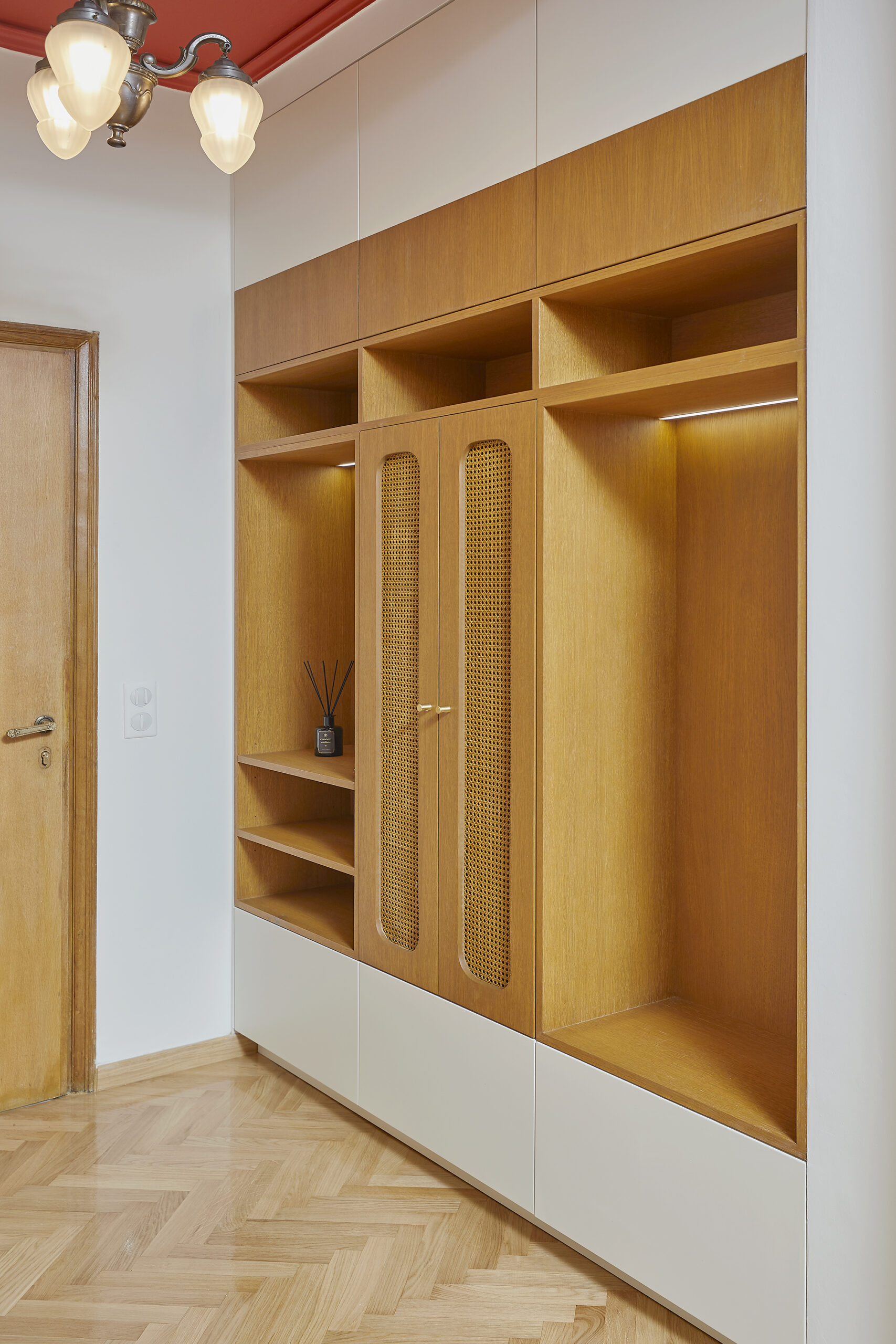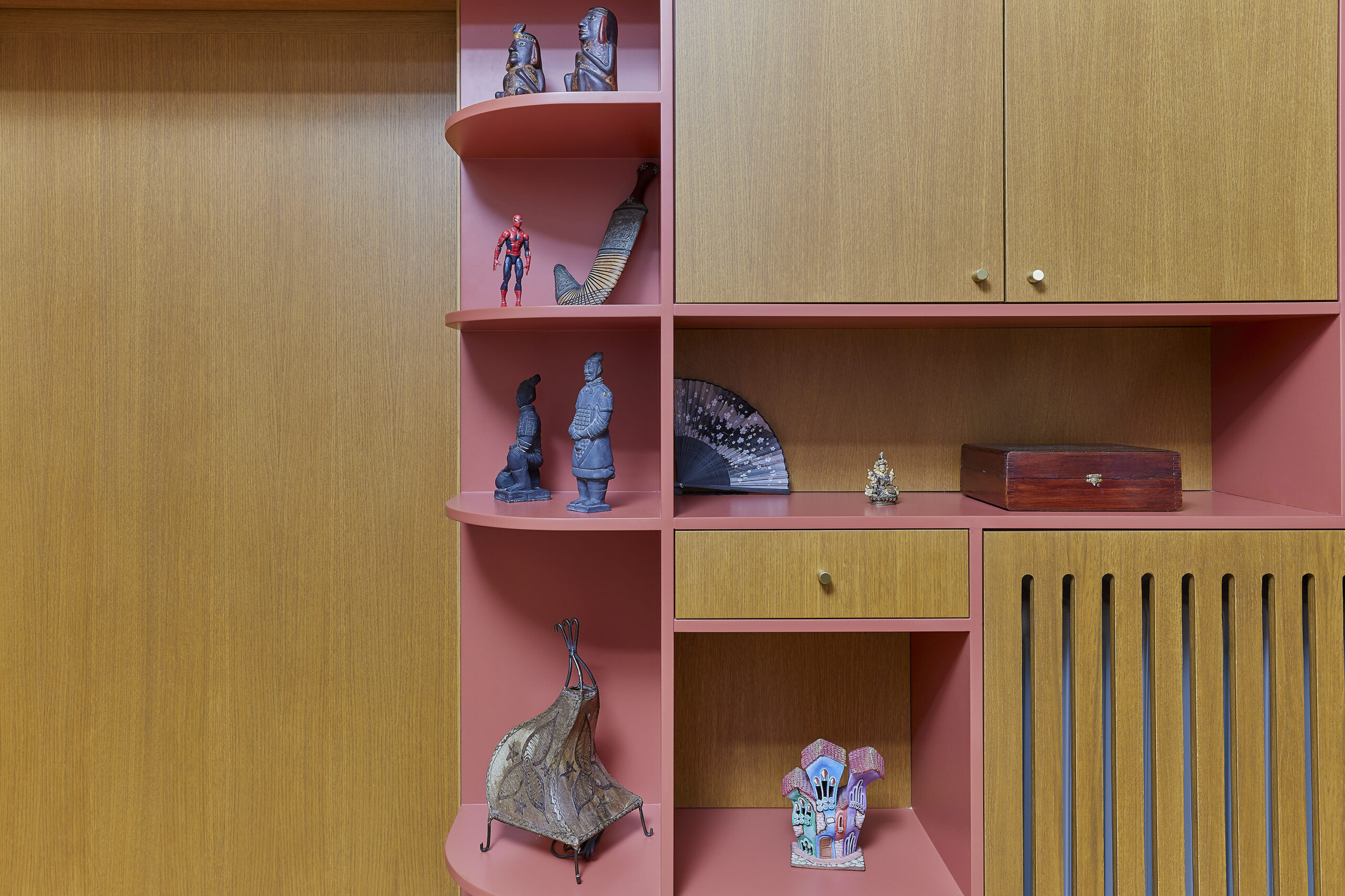 Μια σειρά από έπιπλα σχεδιασμένα ειδικά για το διαμέρισμα δημιουργούν μια παιχνιδιάρικη διάταξη που προέρχεται από τις ανάγκες των ιδιοκτητών και ταυτόχρονα διαμορφώνει τη μοναδική ταυτότητα του διαμερίσματος.