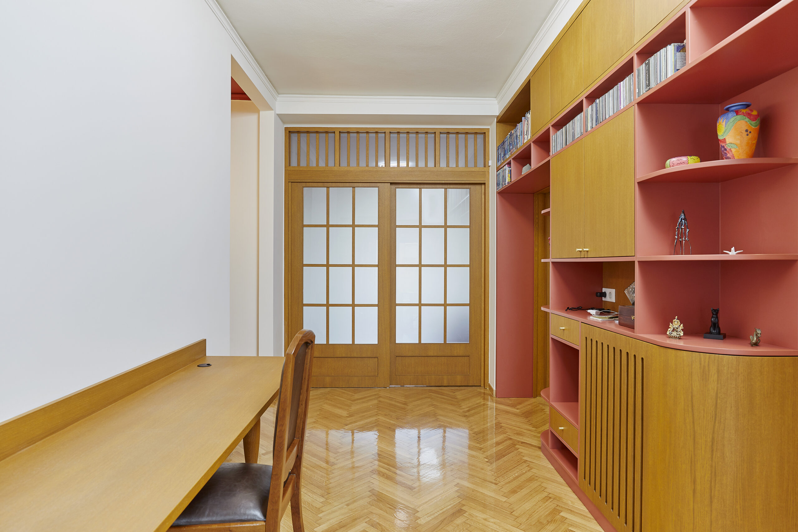 Ο χώρος του γραφείου έχει χωριστεί με δύο συρόμενες ξύλινες πόρτες με ημιδιάφανο τζάμι.