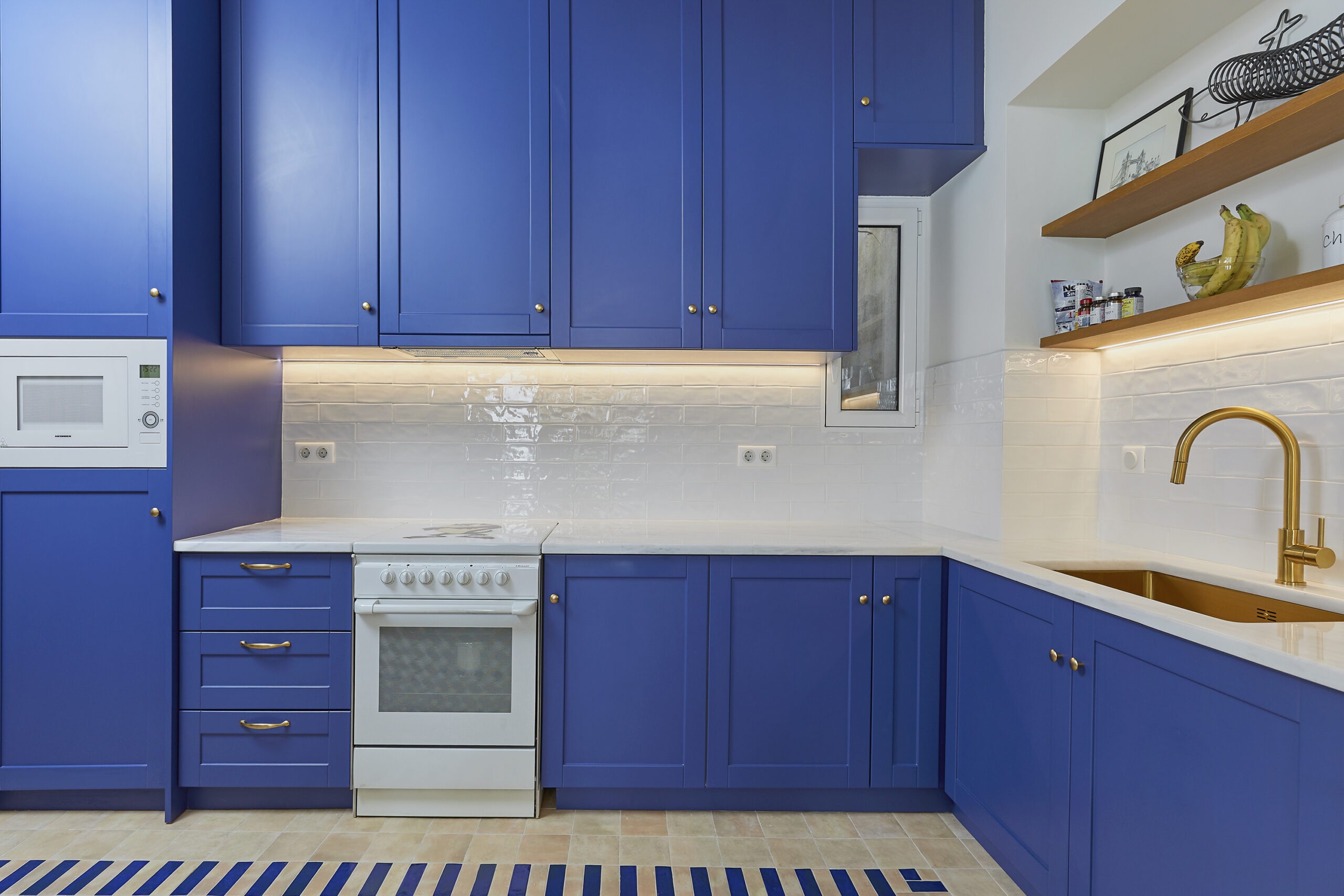 Τα χειροποίητα πλακάκια στο δάπεδο της κουζίνας συνδυάστηκαν με το μπλε του κοβαλτίου των ντουλαπιών.