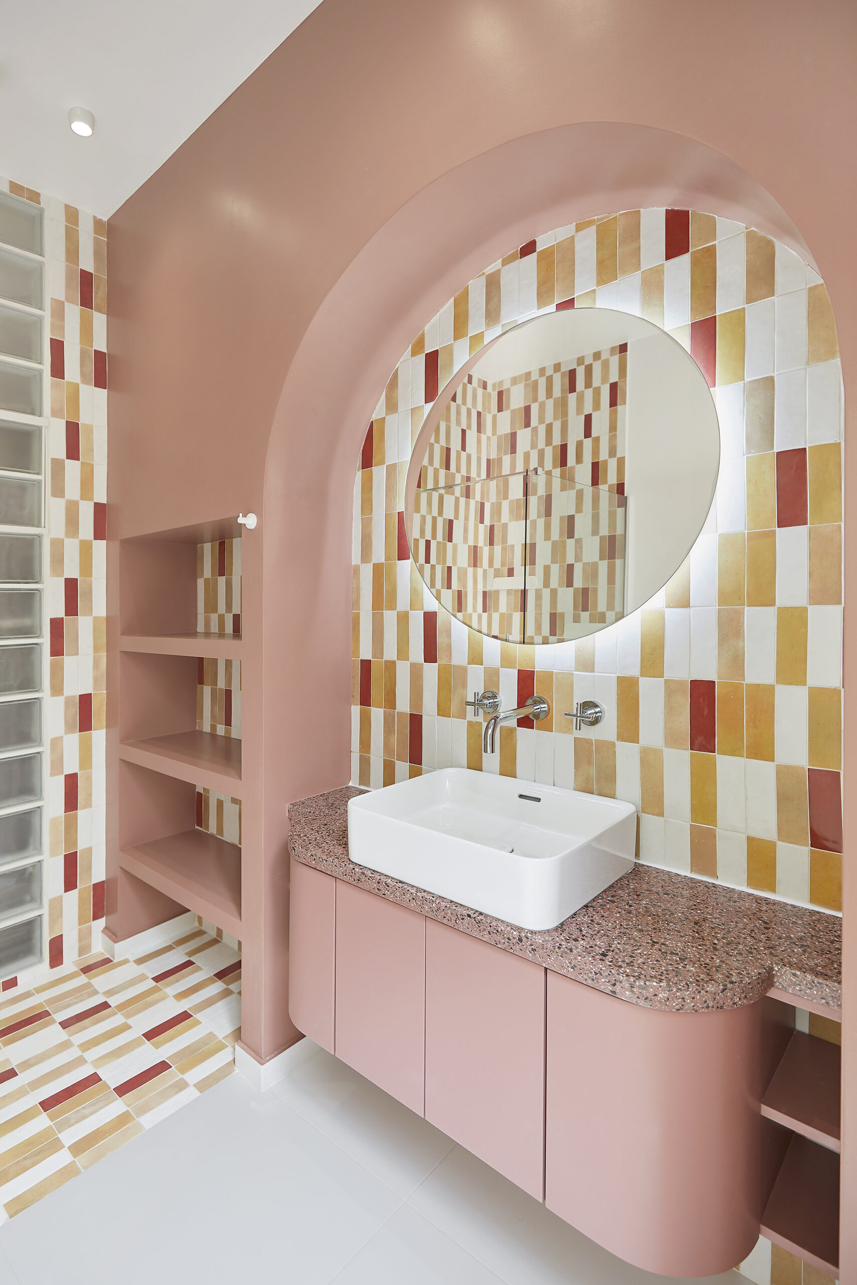 Το νέο λουτρό είναι επενδυμένο με χειροποίητα χρωματιστά πλακίδια, δημιουργώντας έναν οικείο χώρο.