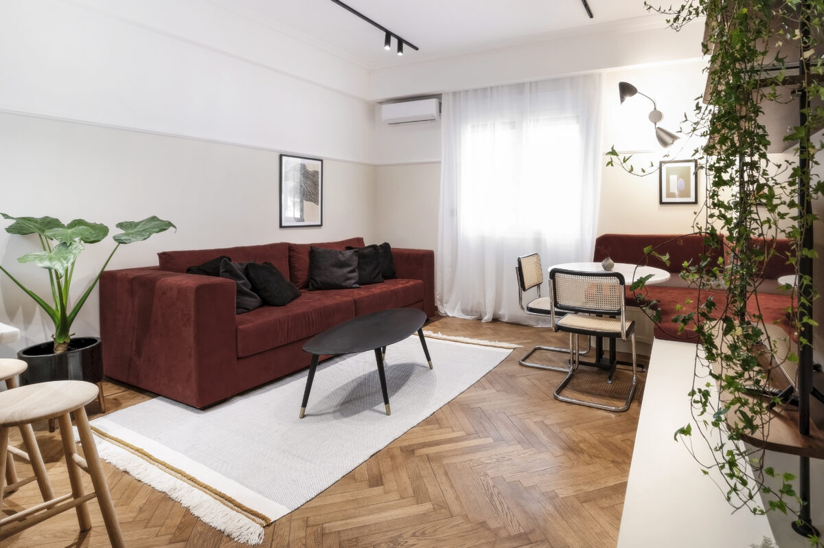 Όσο αφορά στην επίπλωση, αυτή καθρεφτίζει μέχρι ένα σημείο και το ίδιο το κτήριο της Διδότου, οι σχεδιαστικές αναφορές του οποίου αποτέλεσαν βασικό άξονα της αισθητικής προσέγγισης καθορίζοντας τις υφές, τα υλικά, τη χρωματική παλέτα, τα σχήματα και τις γεωμετρίες εντός του χώρου. Έτσι, οι τοίχοι βάφτηκαν σε τόνους του λευκού, ενώ την παράσταση κλέβει ο μεγάλος μπορντό καναπές του σαλονιού. Το ίδιο μπορντό χρώμα συναντάμε και στο κάθισμα που βρίσκεται στην τραπεζαρία. Από τα πιο ιδιαίτερα στοιχεία του χώρου, είναι τα μεγάλα φυτά που έχουν μπει σε συγκεκριμένα σημεία για να χαρίζουν ζωντάνια.