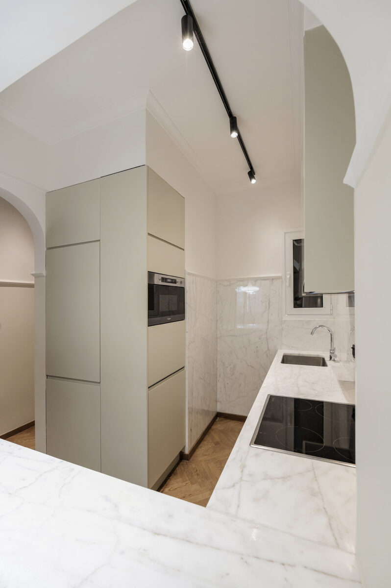 Κουζίνα, καθιστικό και χωλ, ενώθηκαν σε έναν μεγάλο ενιαίο χώρο. Το γραφείο των Ghost Designers, που ανέλαβε την ανακαίνιση του διαμερίσματος, έδωσε ιδιαίτερη προσοχή στην υποστήριξη των επιμέρους δωματίων με τεχνητό φωτισμό. Έτσι, το φως κατέληξε να παίζει πρωταγωνιστικό ρόλο στο «φρεσκαρισμένο» διαμέρισμα της οδού Διδότου.