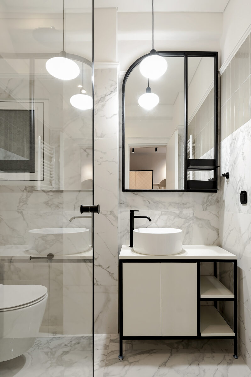 Προκειμένου να καλυφθούν οι νέες ανάγκες του διαμερίσματος, οι Ghost Designers δημιούργησαν ένα καινούριο κοινόχρηστο λουτρό, εντάσσοντας παράλληλα το προϋπάρχον στο ένα υπνοδωμάτιο, επιτρέποντας έτσι την απευθείας πρόσβαση. Στα λουτρά κυριαρχούν οι απλές γραμμές και το λευκό χρώμα, με κάποιες σκούρες μεταλλικές πινελιές, ενώ η πόρτα που χωρίζει την ντουζιέρα από τα υπόλοιπο μπάνιο, είναι διάφανη, για να μοιάζει μεγαλύτερο.