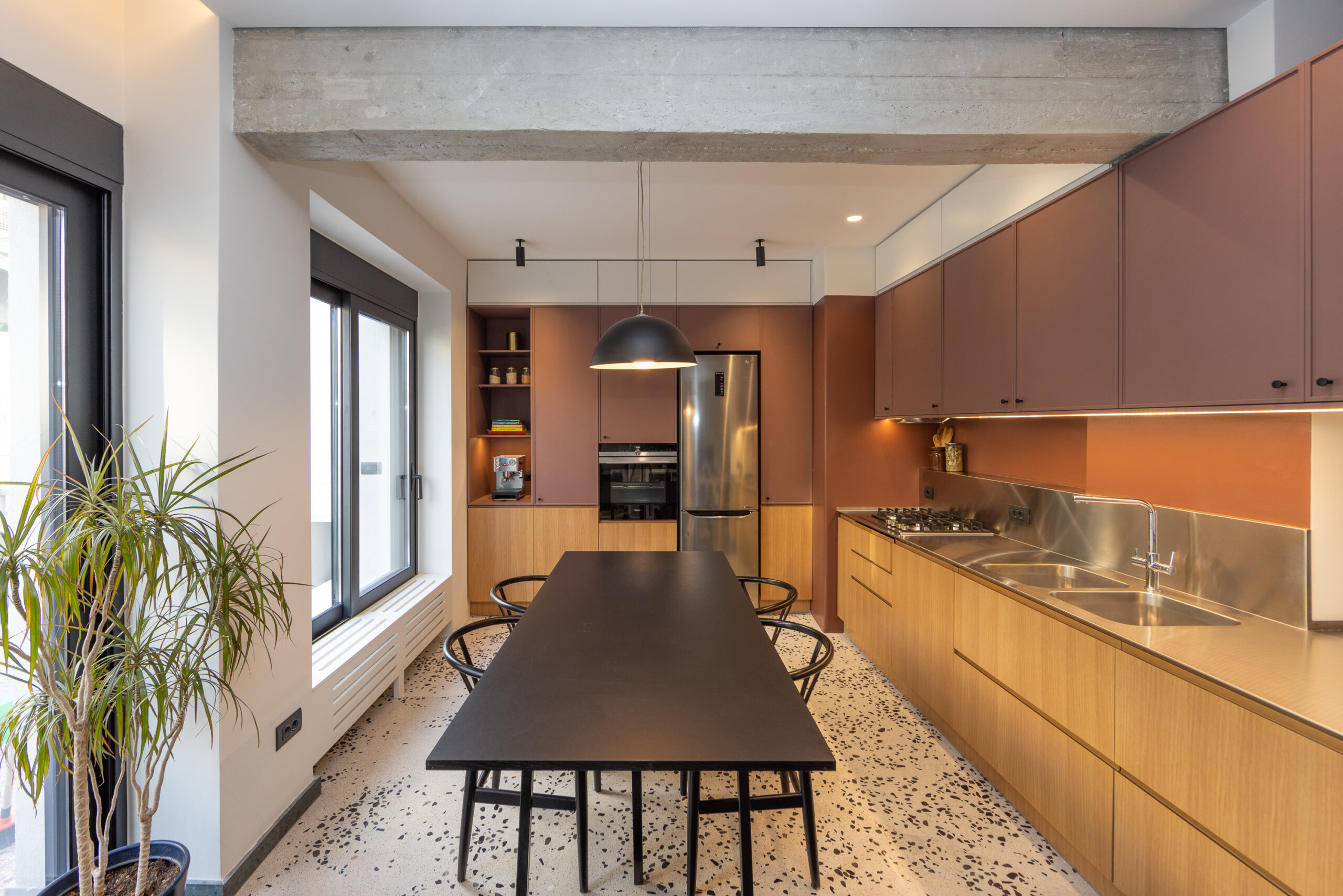 Στο νέο χώρο της κουζίνας, δημιουργήθηκε ένα ασπρόμαυρο μωσαϊκό με σύγχρονη όψη που συνδυάστηκε με το υπάρχον μάρμαρο Τήνου του σαλονιού. Τα δομικά στοιχεία παρέμειναν εμφανή, προσδίδοντας έναν industrial χαρακτήρα στο διαμέρισμα, και σε συνδυασμό με την κουζίνα που πρωτοστατεί στο χώρο – τόσο χρωματικά, όσο και σχηματικά – ο σχεδιασμός αποκτά μία σύγχρονη προσέγγιση.
