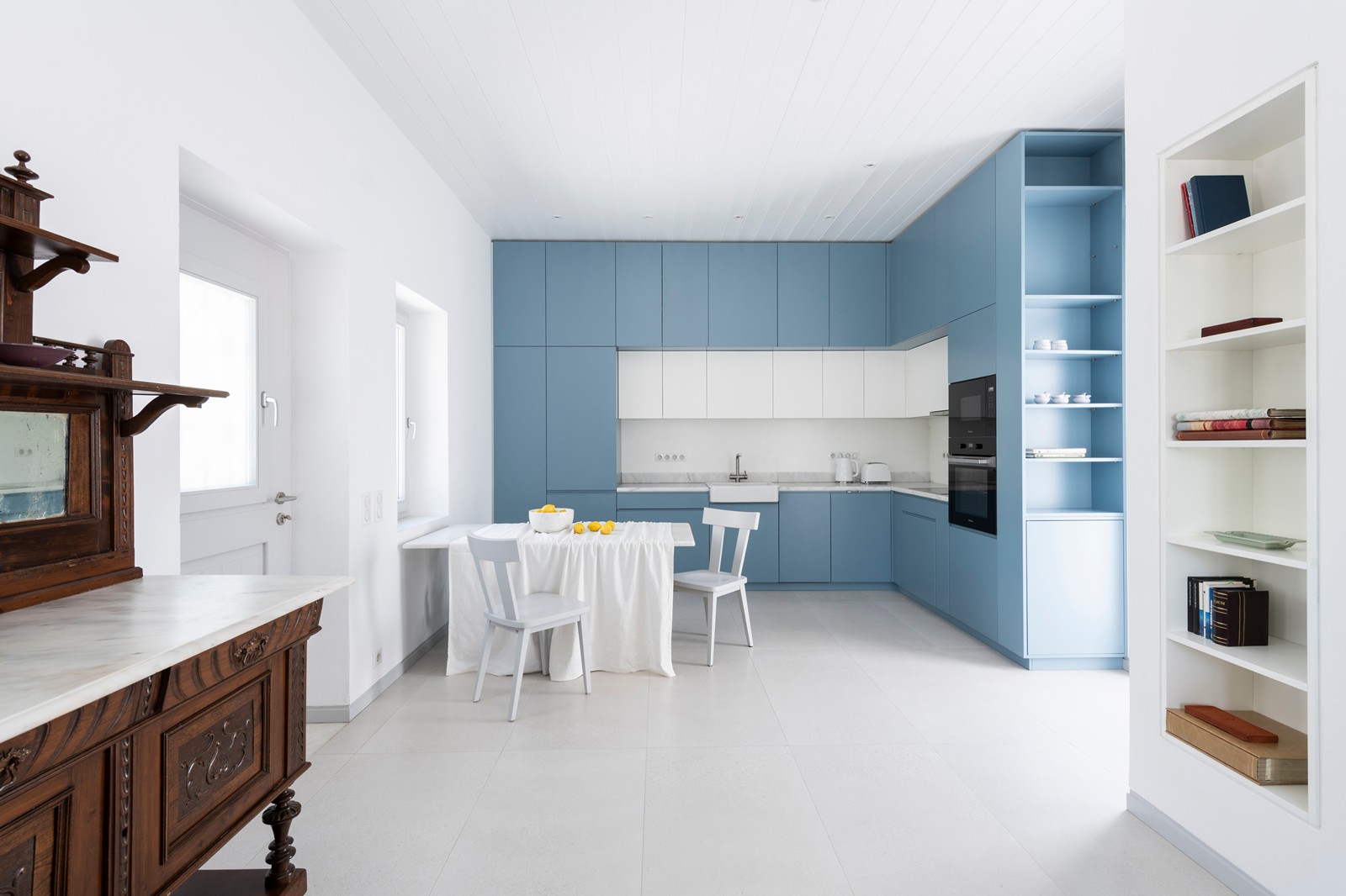 Στο εσωτερικό, αρκετά παλιά έπιπλα επαναχρησιμοποιούνται, ενώ χρωματικά μια κυρίως ουδέτερη παλέτα λευκών και γκρι επικαλύπτει τις περισσότερες επιφάνειες και εξισορροπεί τις εντάσεις ανάμεσα στο σύγχρονο και ζωηρό μπλε χρώμα των λακαρισμένων ντουλαπιών της κουζίνας και το σκούρο χρώμα του ξύλου των παλιών επίπλων.