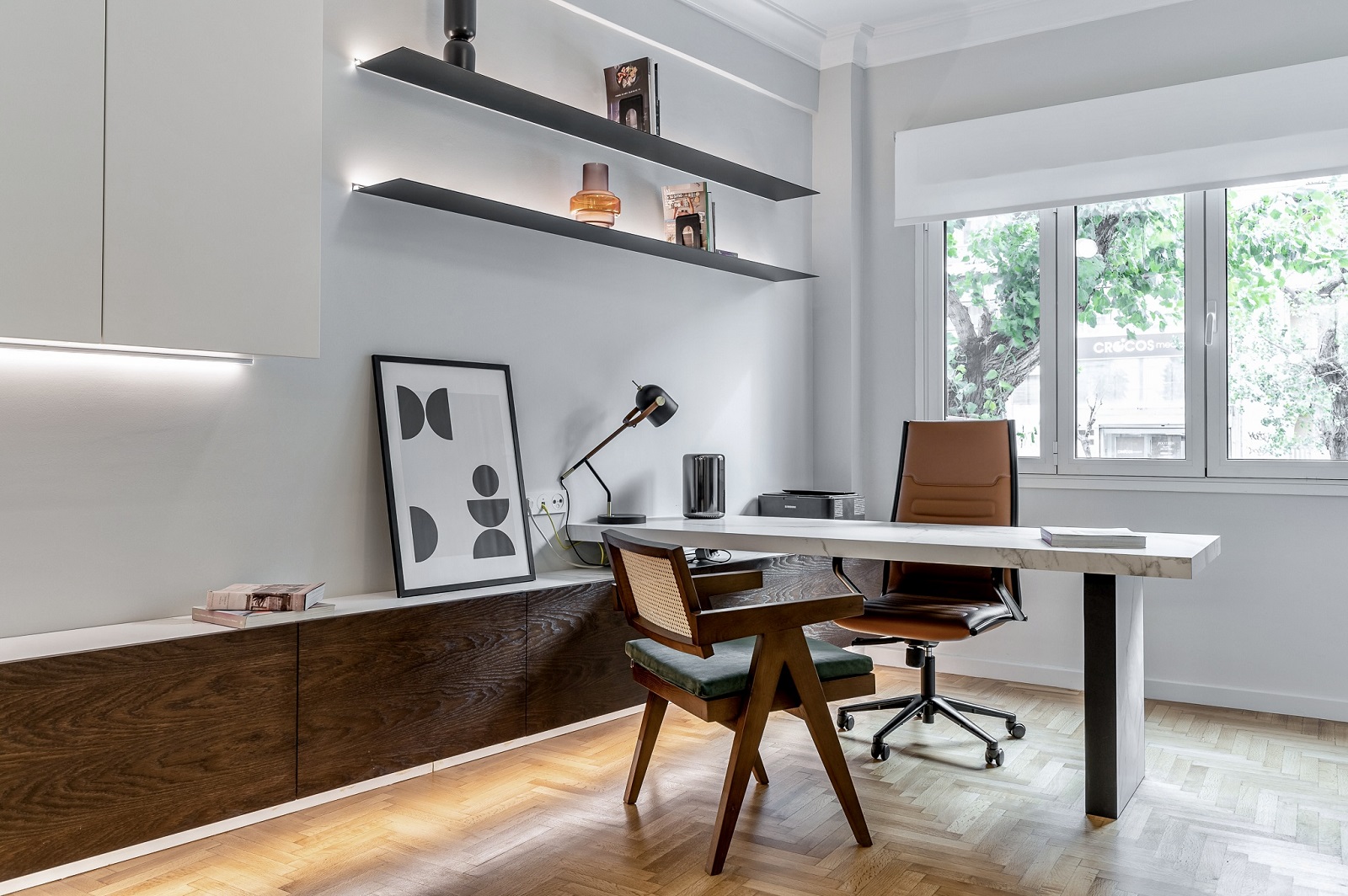 Ένας υβριδικός χώρος που ενσωματώνει κατοίκηση και ανεξάρτητο χώρο εργασίας ήταν ο στόχος, και η αρχιτέκτονας Γκέλυ Δημητρακοπούλου ανέλαβε να τον συναντήσει με τη ριζική ανακαίνιση του ισόγειου διαμερίσματος των 80 τ.μ. σε μια τυπική αθηναϊκή πολυκατοικία του ’50, στην περιοχή των Αμπελοκήπων.