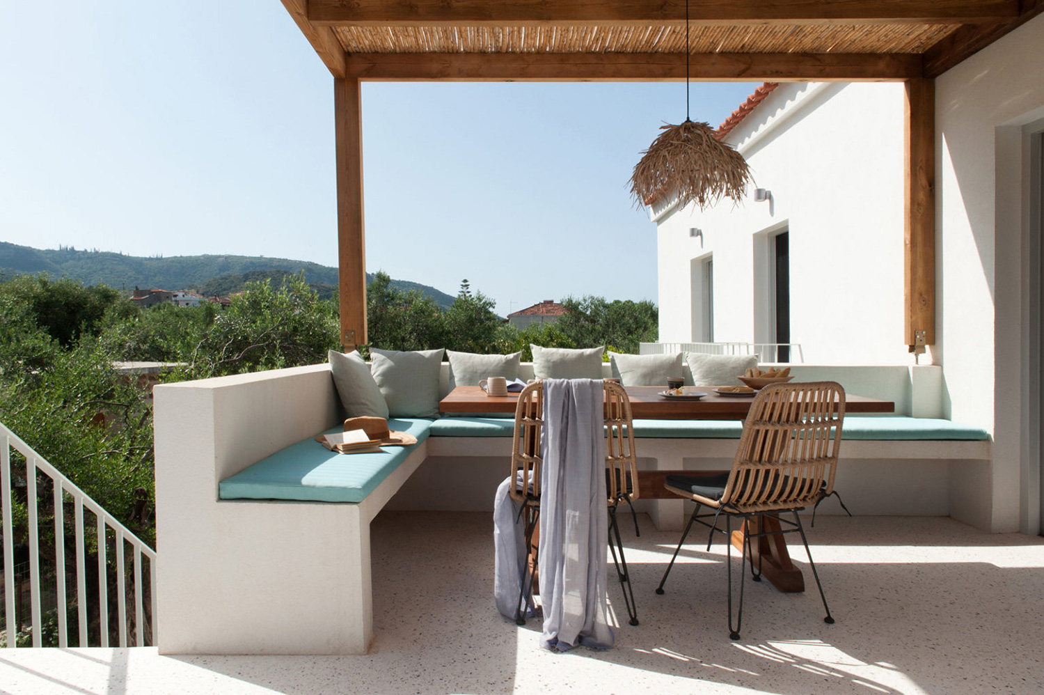 Εδώ, δημιουργήθηκε μια υπαίθρια τραπεζαρία με ενσωματωμένο πάγκο και ένα μασίφ τραπέζι iroko. Η πέργκολα προστατεύει από τον ήλιο όποιον κάθεται και αγναντεύει την κορυφή του Ταΰγετου.