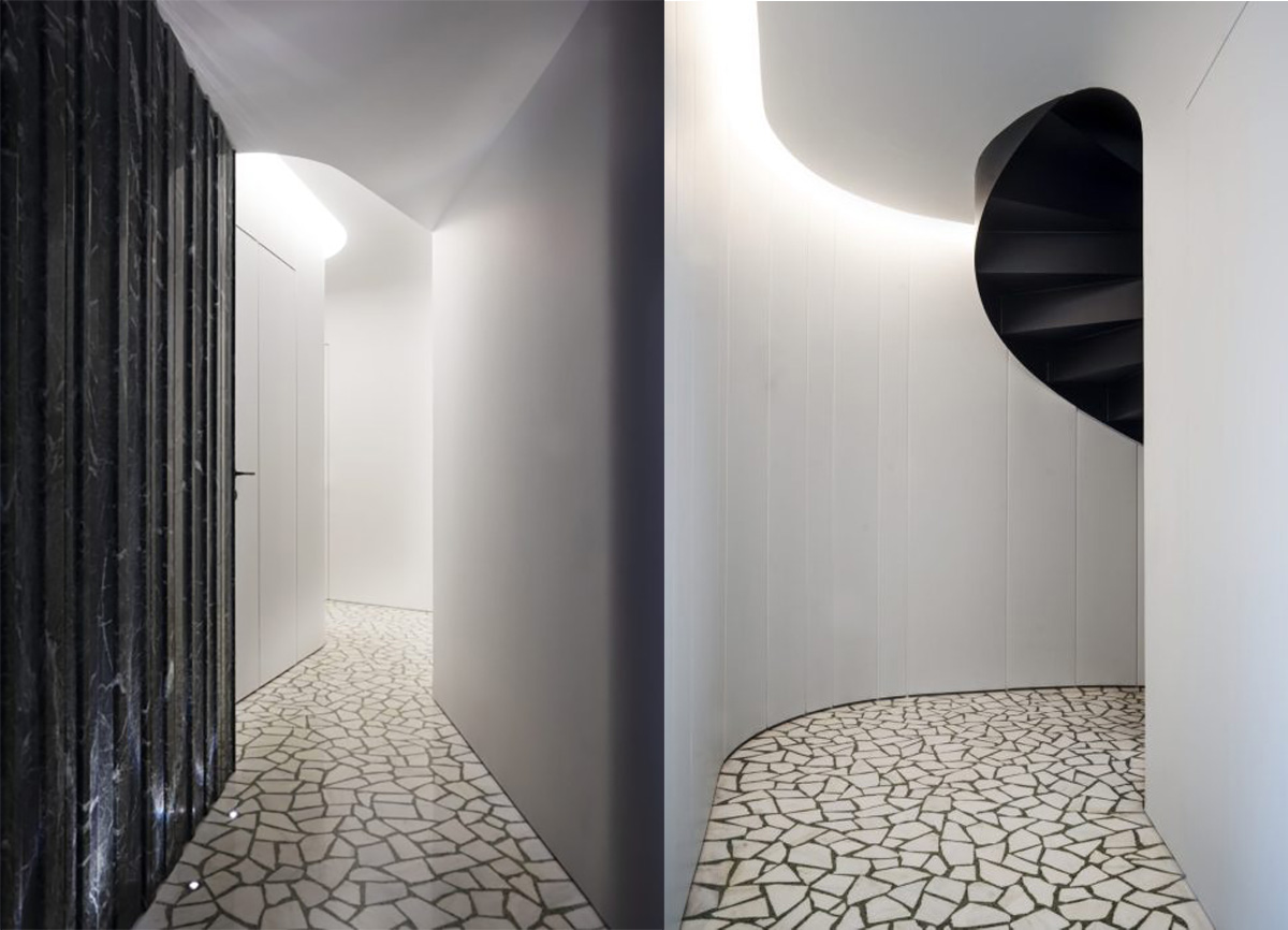 Περνώντας στην είσοδο του 7ου ορόφου, ένας τοίχος από πράσινο σκαλιστό μάρμαρο Τήνου, σε συνδυασμό με τα μωσαϊκά πατώματα Paladiano, συνθέτουν την αξέχαστη πρώτη εντύπωση του επισκέπτη, και δρουν ως μια ελαφριά πρόγευση για την μοντέρνα αρχιτεκτονική που διαπνέει τους χώρους του ρετιρέ.