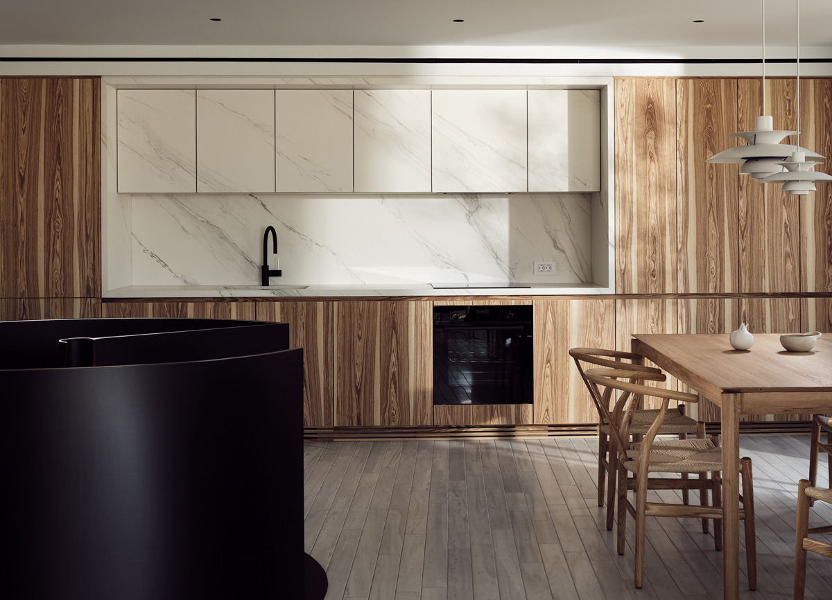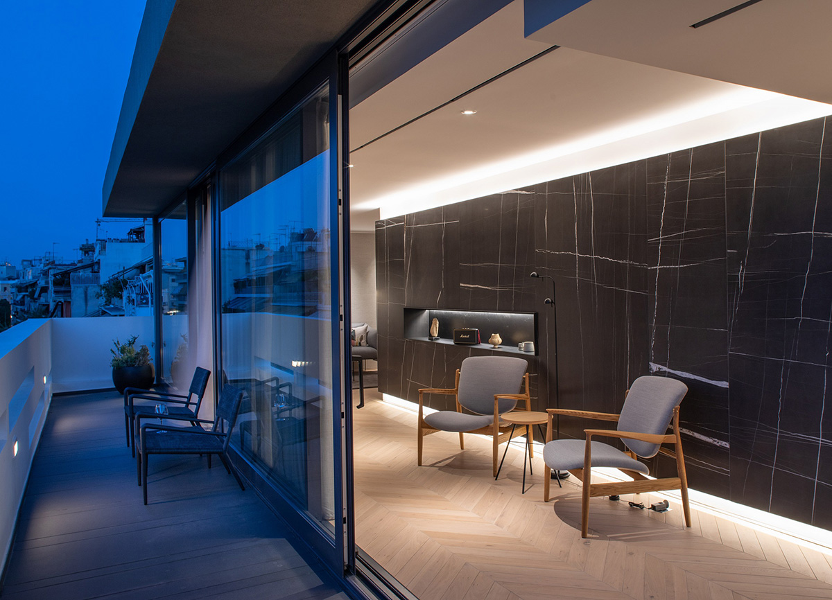 Μάρμαρα και γραμμικά μοτίβα, παρκέ σεβρόν και μωσαϊκά πατώματα νοσταλγικά συνδεδεμένα με την χαρακτηριστική αθηναϊκή πολυκατοικία του ’50, με μοντέρνες νότες φρεσκάδας και σχεδίου διαπερνούν όλο τον κτιριακό οργανισμό που φιλοξενεί το λιτό και διακριτικά πολυτελές προφίλ του ρετιρέ.