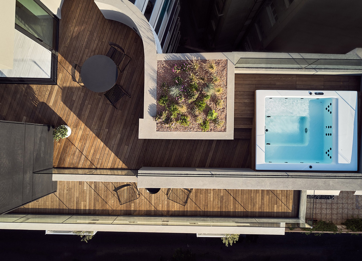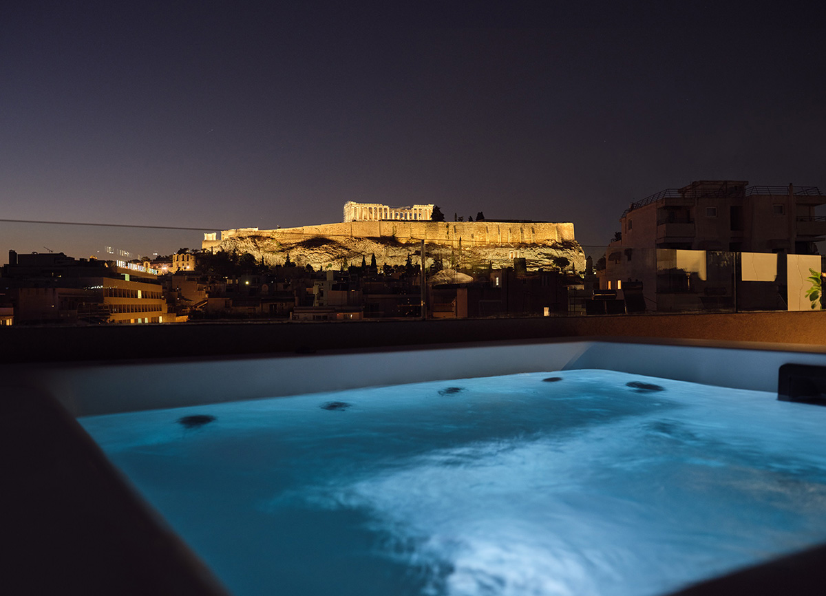 Η ιδιωτική ταράτσα καλωσορίζει τον επισκέπτη με υδρομασάζ, καθιστικό χώρο με διάτρητο μεταλλικό σκίαστρο, μικρό κήπο με αρωματικά βότανα και εκπληκτική θέα στο Αθηναϊκό τοπόσημο, που κόβει την ανάσα.