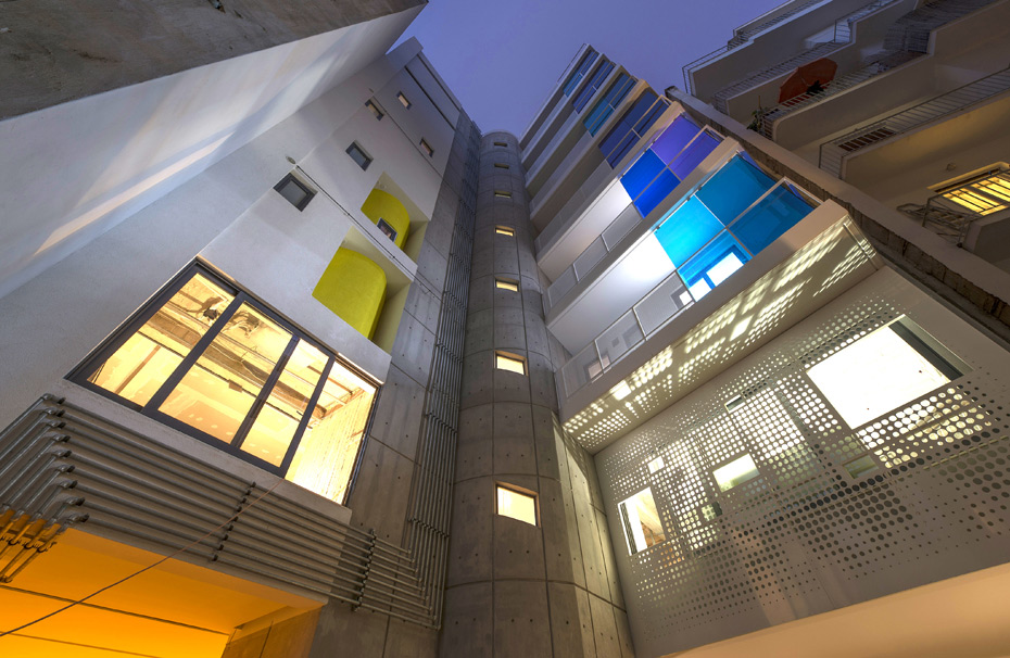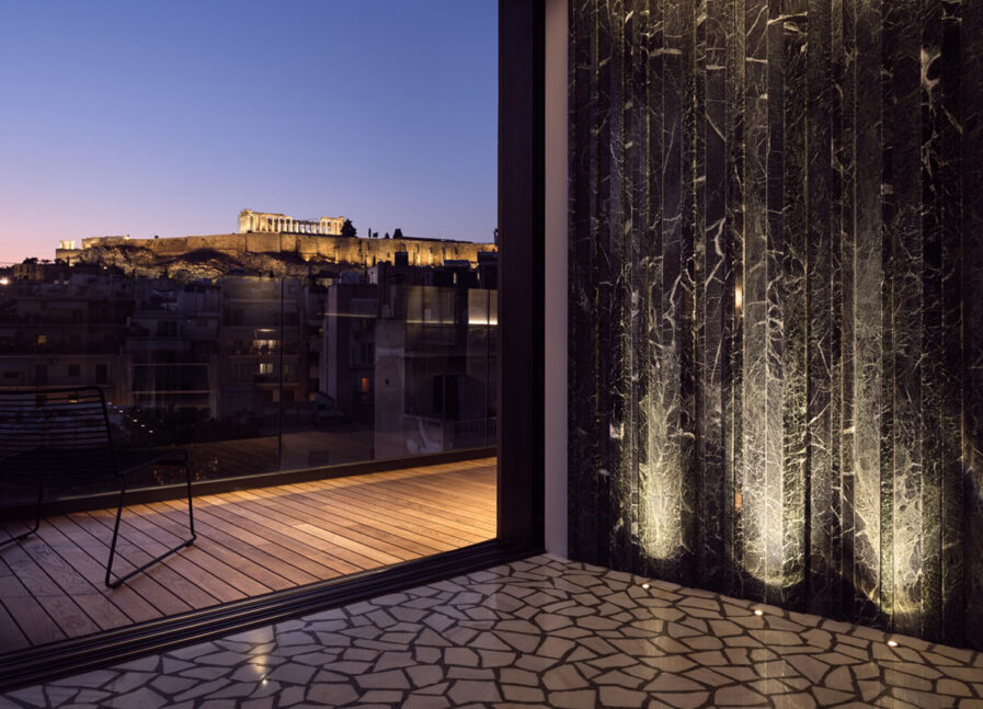 Μετά τον 5ο όροφο, ο κτιριακός όγκος χρειάστηκε να υποχωρήσει λόγω ελληνικών οικοδομικών κανονισμών, γι’ αυτό δημιουργήθηκε ένα ρετιρέ με διάφανη και απέραντη γυάλινη πρόσοψη, σε ανοιχτό «διάλογο» με τον βράχο της Ακρόπολης που στέκεται απέναντι.