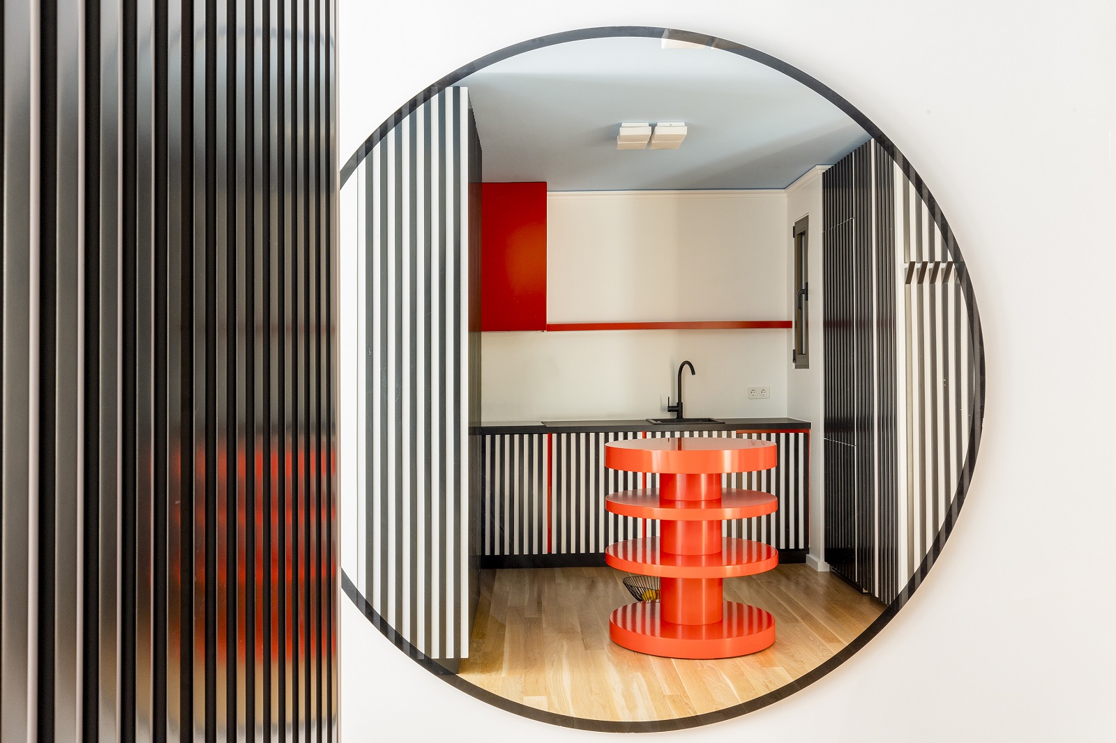 Οι μαύρες λωρίδες ανυψώνονται, δημιουργώντας μια τρισδιάστατη επιφάνεια που δεν είναι απλώς διακοσμητική, αλλά αναπόσπαστο μέρος της δομής. Ένας μεγάλος επιτοίχιος κυκλικός καθρέφτης απέναντι από την κουζίνα επαναλαμβάνει το ριγέ μοτίβο.