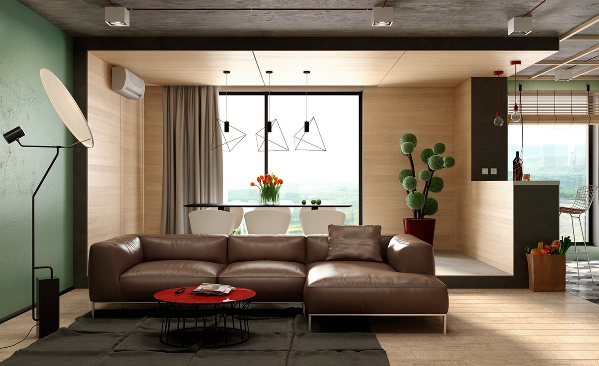 Οι γκρίζοι τοίχοι του διαμερίσματος έρχονται σε όμορφη αντίθεση με το πολύχρωμο χαλί και την κόκκινη πολυθρόνα. Οι δύο πίνακες στον τοίχο και το χρυσό εκκρεμές από το ταβάνι δίνουν έξτρα πόντους ιδιαίτερης αισθητικής.
