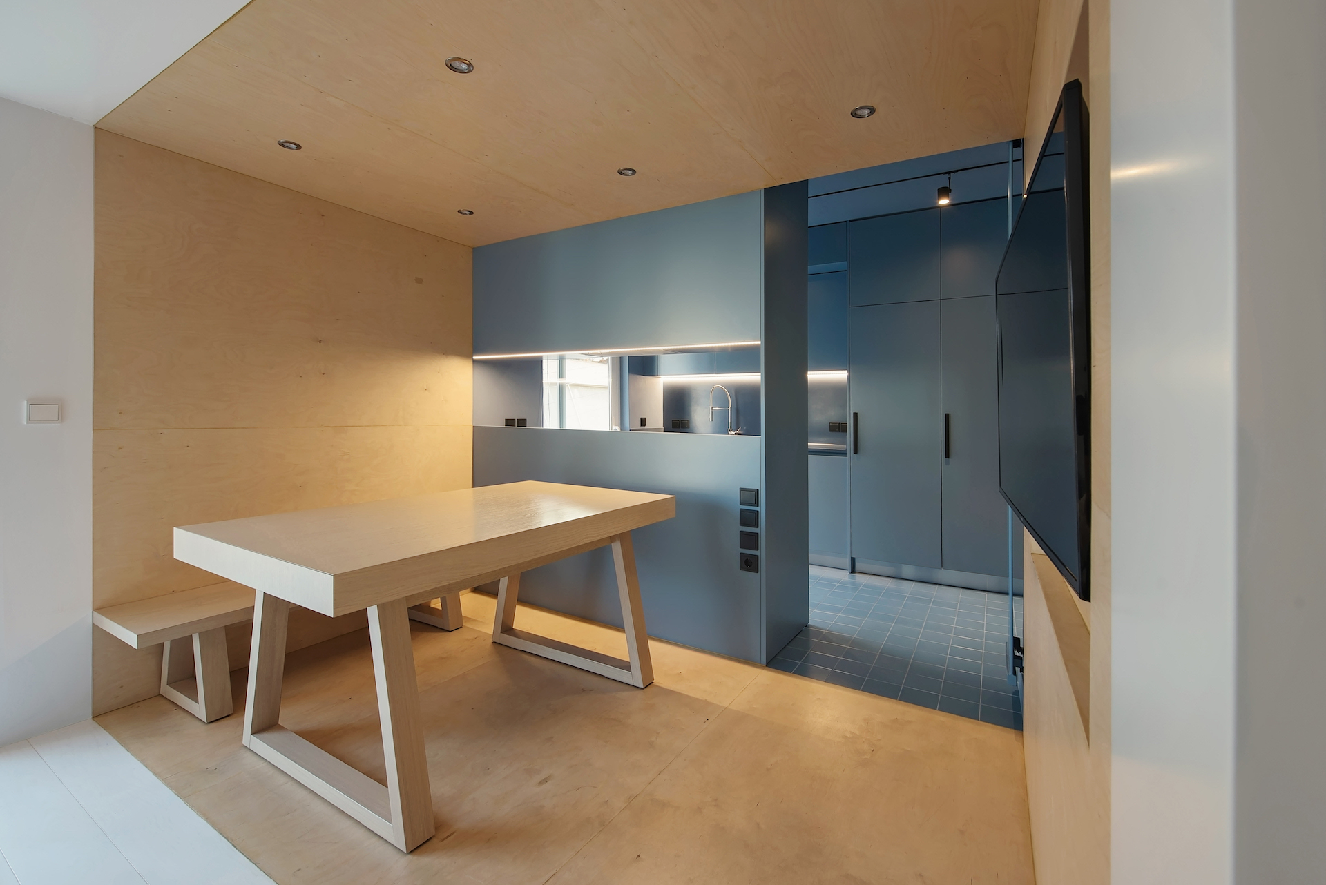 Η καρδιά του διαμερίσματος είναι η ξύλινη τραπεζαρία. «Το ενιαίο υλικό που διαπερνάει τοίχους, δάπεδο και οροφή, καθώς και το χαμήλωμα του ύψους, μετατρέπει τον χώρο σε κατώφλι, στην πιο χαρακτηριστική εφαρμογή του. Αυτή η ενδιάμεση περιοχή είναι ένα θραύσμα έντασης και παύσης. Από αυτό το σημείο συνάθροισης και συνύπαρξης η κατάσταση της διαδοχικής μετάβασης μετατρέπεται σε καθημερινή εμπειρία για την οικογένεια», καταλήγουν ο Γιάννης Καραχάλιος και η Ελισάβετ Πλαΐνη.