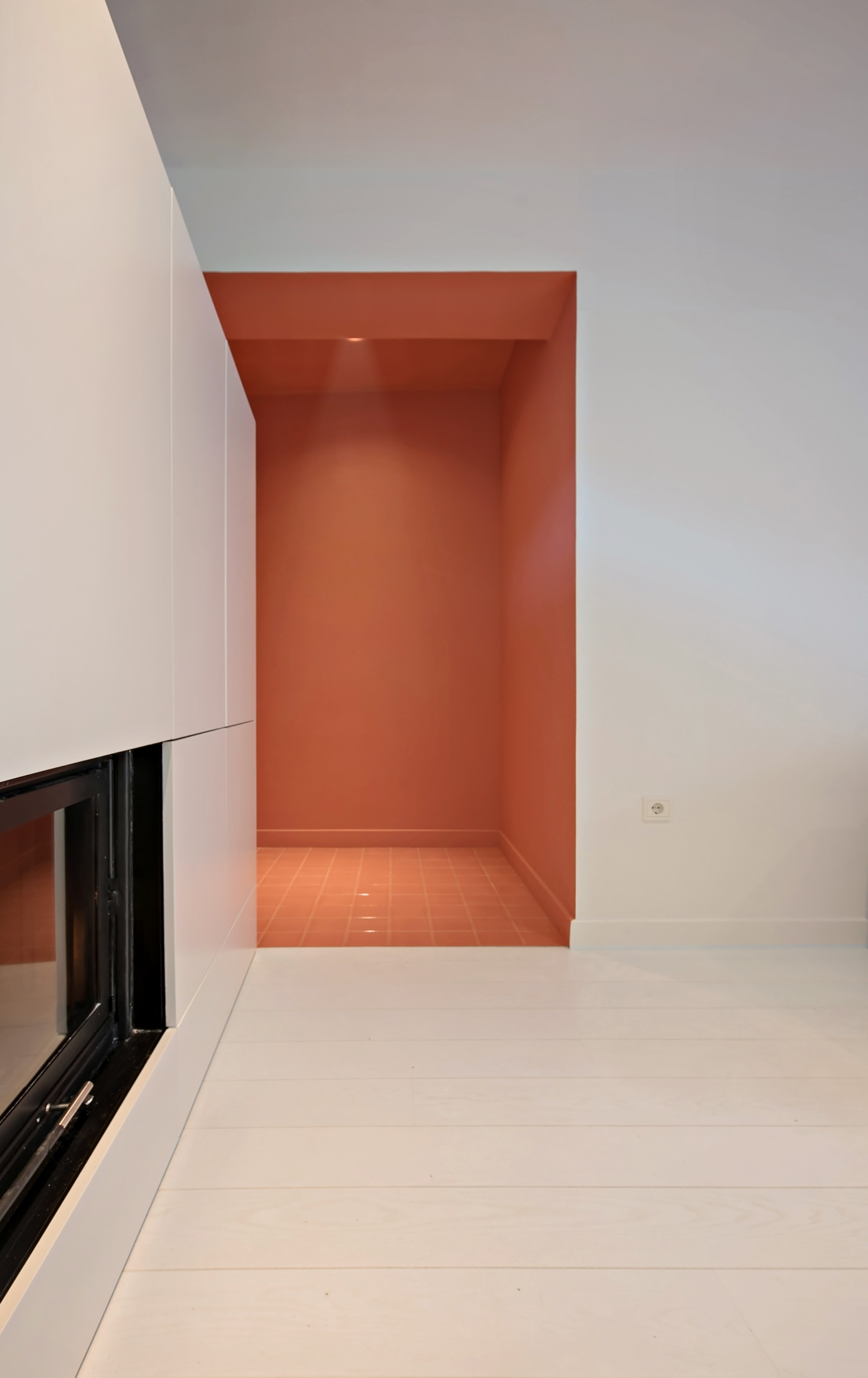 Οι μεταβάσεις στους δημόσιους χώρους συντελούνται μέσω των περιοχών-χρωμάτων: του ροζ χωλ εισόδου, του λευκού καθιστικού, της ξύλινης τραπεζαρίας και της μπλε κουζίνας.