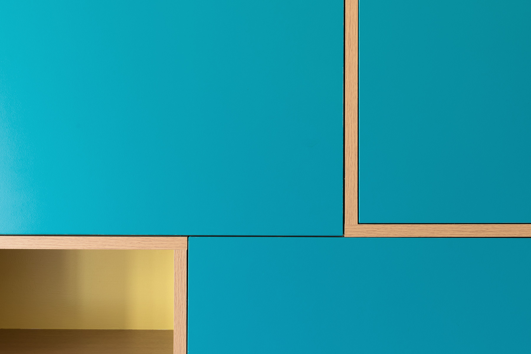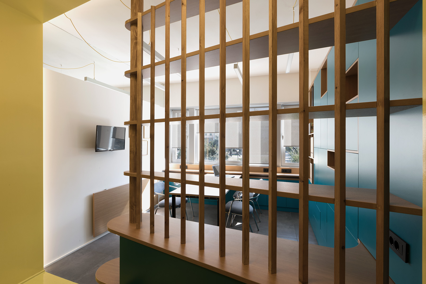 Μέρος του επίπλου είναι το πάσο που διαθέτει ράφια και κατακόρυφες περσίδες, που επιτρέπει στον επισκέπτη να του αποκαλύπτεται ο χώρος του γραφείου σταδιακά κάνοντας τον διαχωρισμό ιδιωτικού – δημοσίου σαφή αλλά ήπιο.
