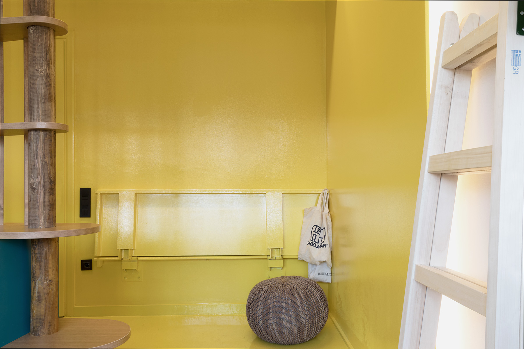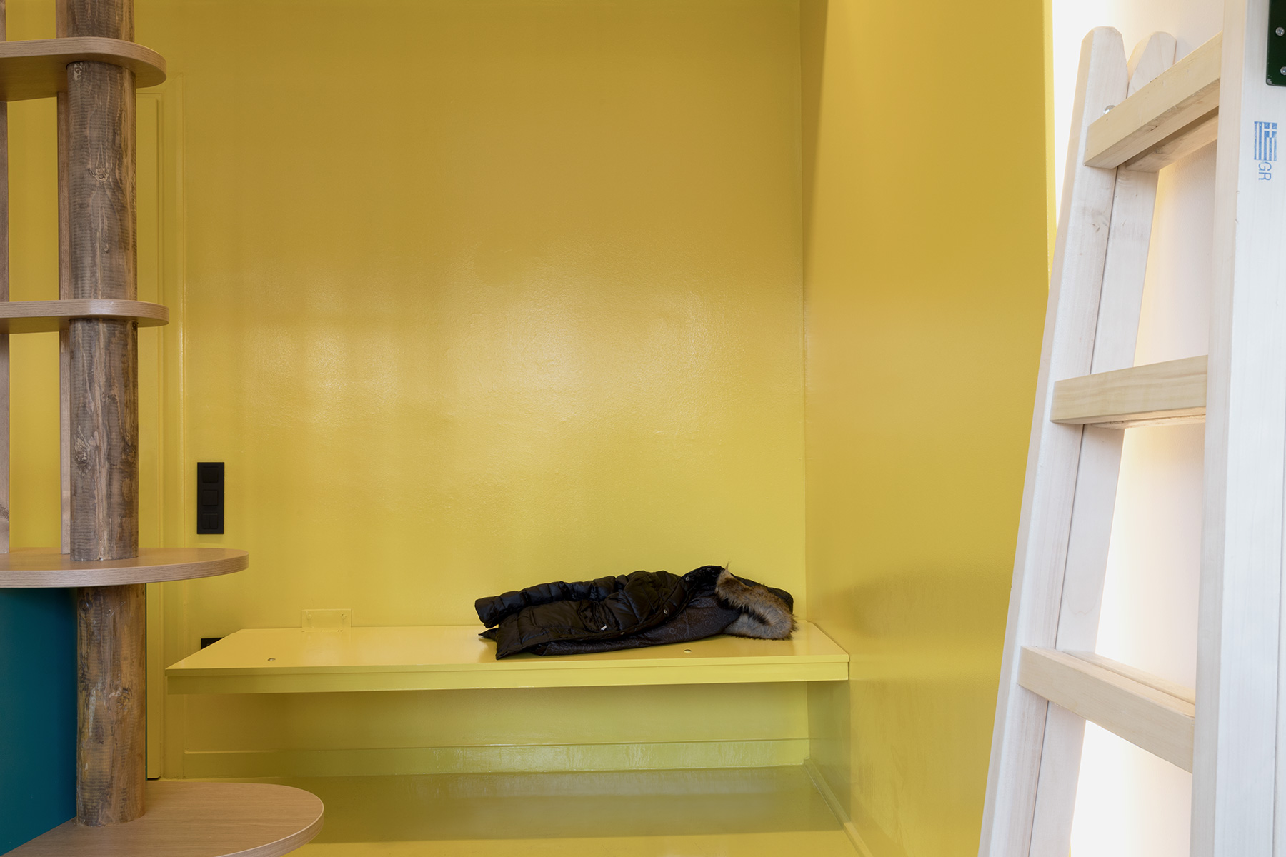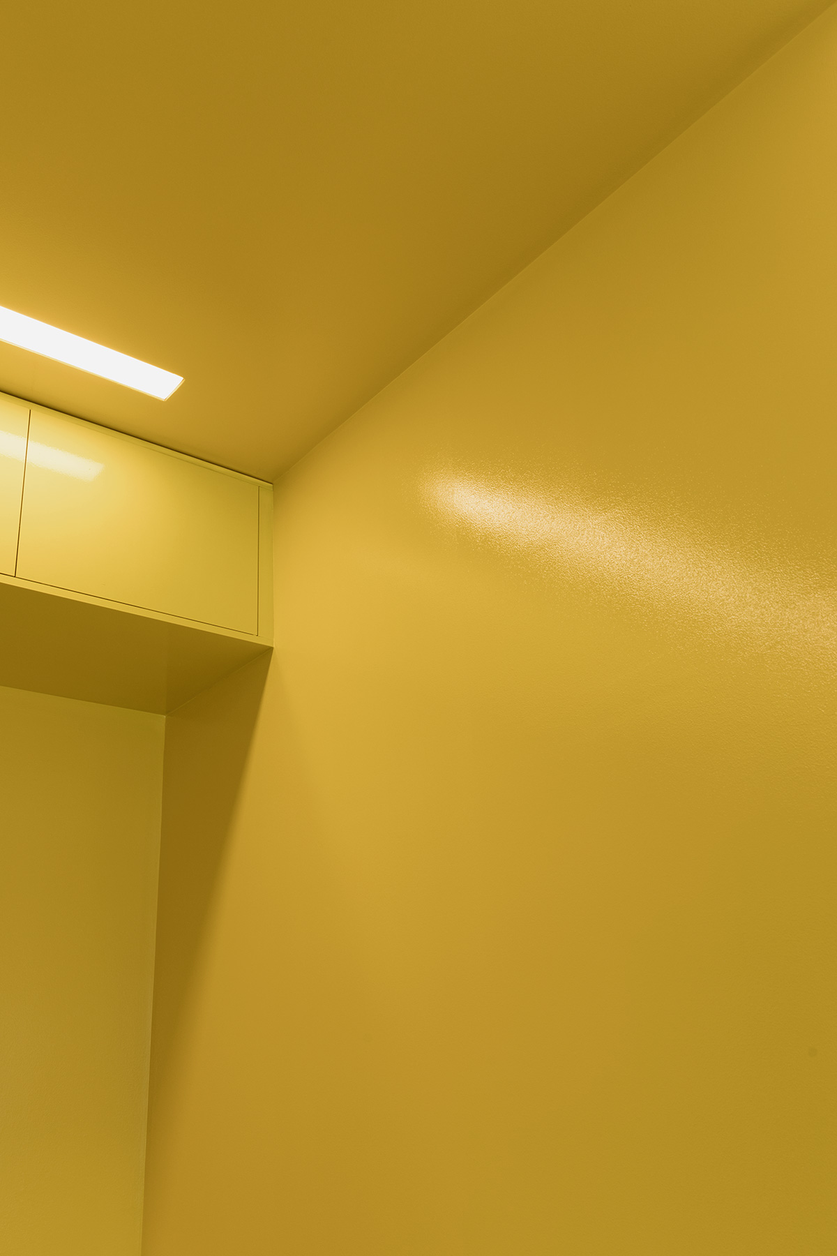 Ιδιαίτερο ενδιαφέρον παρουσιάζει ο προθάλαμος. Προκειμένου να διαφοροποιείται εντελώς από το υπόλοιπο γραφείο και να δημιουργείται η αντίληψη της εισχώρησης ενός μικρού χώρου μέσα σε έναν μεγαλύτερο, ο χώρος του προθαλάμου διαμορφώθηκε σε χαμηλότερο ύψος από το υπόλοιπο γραφείο και βάφτηκε σε έντονο κίτρινο χρώμα.