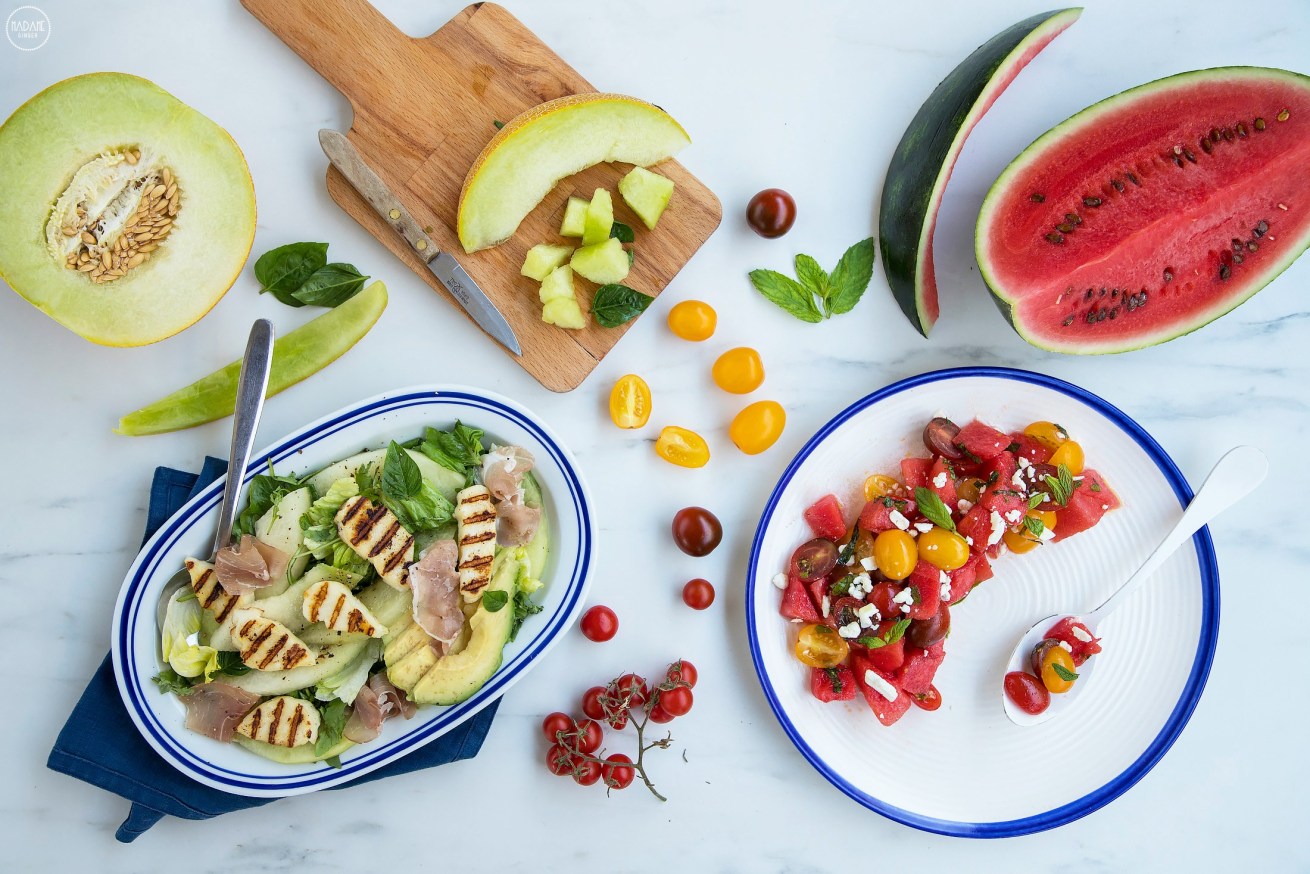 Σαλάτα με καρπούζι, ντοματίνια και φέτα & σαλάτα με πεπόνι, προσούτο και χαλούμι
