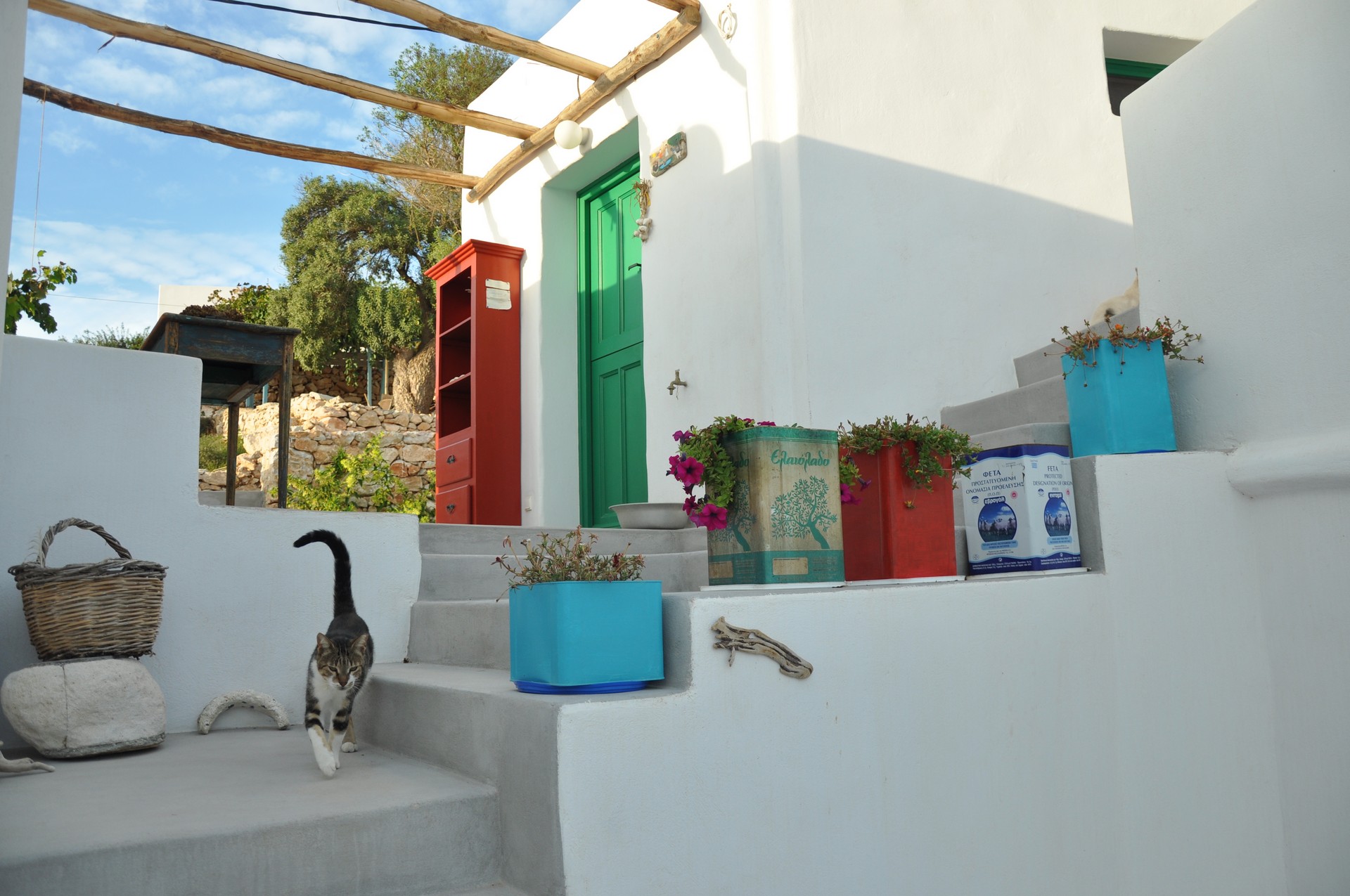Άλλο μορφολογικό παραδοσιακό στοιχείο που επηρέασε την εξωτερική όψη του νέου κτιρίου είναι η συμμετρική πρόσοψη με την είσοδο στη μέση και δυο παράθυρα εκατέρωθεν. Το έντονο πράσινο χρώμα στα κουφώματα υπήρξε επίσης τυπικό για το νησί, καθώς και η «κουτσομπόλα» – η έξυπνη πόρτα εισόδου η οποία μπορεί να ανοίγει από τη μέση και πάνω λειτουργώντας και ως παράθυρο. Λεπτομέρειες της εσωτερικής διαμόρφωσης, όπως τα υπερυψωμένα χτιστά κρεβάτια, οι πατητές τσιμεντοκονίες μεταφέρουν την παραδοσιακή ατμόσφαιρα και μέσα. Η εσωτερική διαρρύθμιση των χώρων όμως δεν ακολουθεί τον παραδοσιακό κανόνα με τη «σάλα» στην πρόσοψη, αλλά δόθηκε προτεραιότητα στη λειτουργικότητα και σε υπνοδωμάτια με θέα στο χωριό, το Αιγαίο και τα γύρω νησιά.