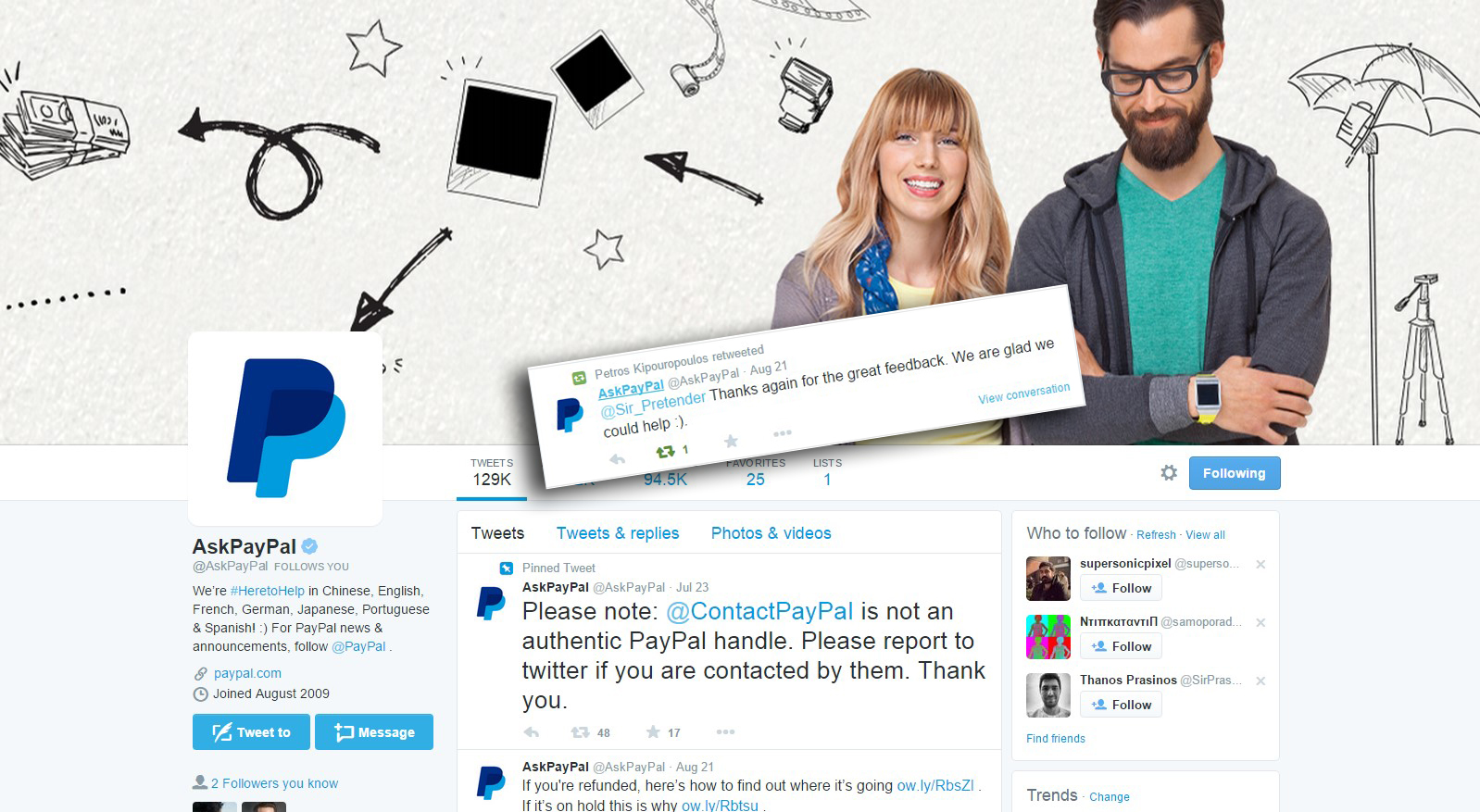 Αυτό που με εντυπωσίασε αγαπητοί μου στην όλη υπόθεση δεν ήταν η ταχύτητα με την οποία διευθετήθηκε το θέμα μου. Αν κάτι με κέρδισε ολοκληρωτικά, ήταν ο τρόπος που «ανακάλυψαν» στο PayPal το παράπονό μου και το πώς «έσκυψαν» πάνω από το πρόβλημά μου. Στις δύο μέρες που βρισκόμουν σε ανοιχτή γραμμή με τον λογαριασμό @AskPayPal ένιωθα πως μιλούσα με κάποιον που ενδιαφερόταν πραγματικά να λύσει το πρόβλημα. Τι κι αν είμαι ένας μέσα στα εκατομμύρια των πελατών της εταιρείας ανά τον κόσμο; Δεν μπορώ να σας περιγράψω πόσο σημαντικός νιώθω πλέον.