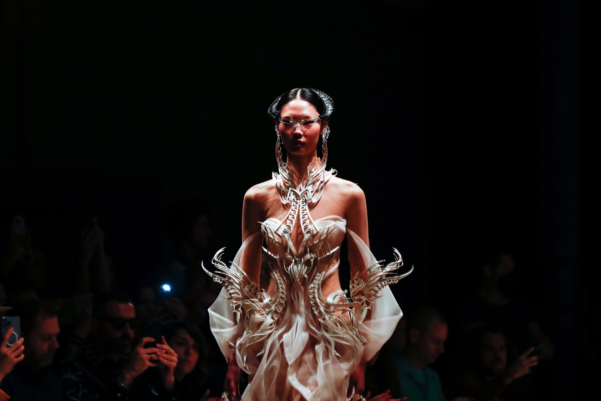 epa10051603 A model presents a creation from the Fall/Winter 2022/23 Haute Couture collection by Dutch designer Iris Van Herpen during the Paris Fashion Week, in Paris, France, 04 July 2022. The presentation of the Haute Couture collections runs from 04 to 07 July 2022. EPA/Mohammed Badra