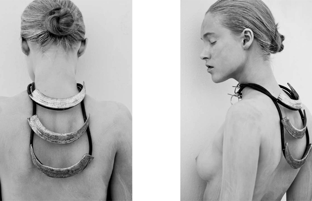 Παράλληλα με τα (πολύ απλά σε σύγκριση με τις προηγούμενες απόπειρές του στην πονεμένη ιστορία που καλούμε Ελληνική Μόδα) ρούχα και σε άμεση συνάρτηση με αυτά, ο Δημήτρης σχεδίασε και μια μικρή σειρά κοσμημάτων μασίφ και βαρέων, που θυμίζουν ευρήματα παλαιοντολογίας και σκελετούς πρώην ζώντων οργανισμών. Αυτά μπορείς να τα φορέσεις και μόνα τους, φυσικά, αλλά το απλό, εντελώς δωρικό τους ύφος τα εντάσσει εύκολα στο moodboard της συλλογής, και στα αισθητικά πλάνα που είχε στο μυαλό του κατά τον σχεδιασμό της: αρχέγονη θηλυκότητα και επιστροφή σε βασικές, σχεδόν ελλειπτικές φόρμες.