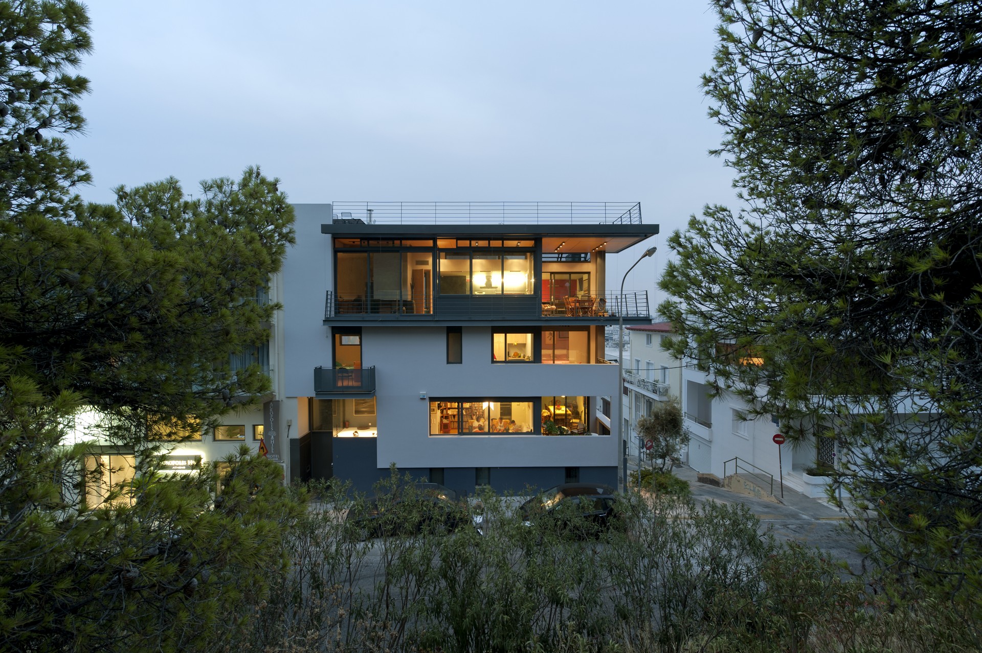 Στον περιφερειακό του Φιλοπάππου, μια διπλοκατοικία εντάσσεται στο μέτωπο που σχηματίζουν τα κτίρια με θέα προς τον λόφο και την Ακρόπολη. Πρόκειται για ένα σύγχρονο κτίριο που βρίσκεται στο όριο μεταξύ του πυκνού οικοδομικού ιστού και του φυσικού αττικού τοπίου. Το Filopappou Hill προσφέρει στους κατοίκους του οπτικές φυγές προς την πόλη και τη θάλασσα.