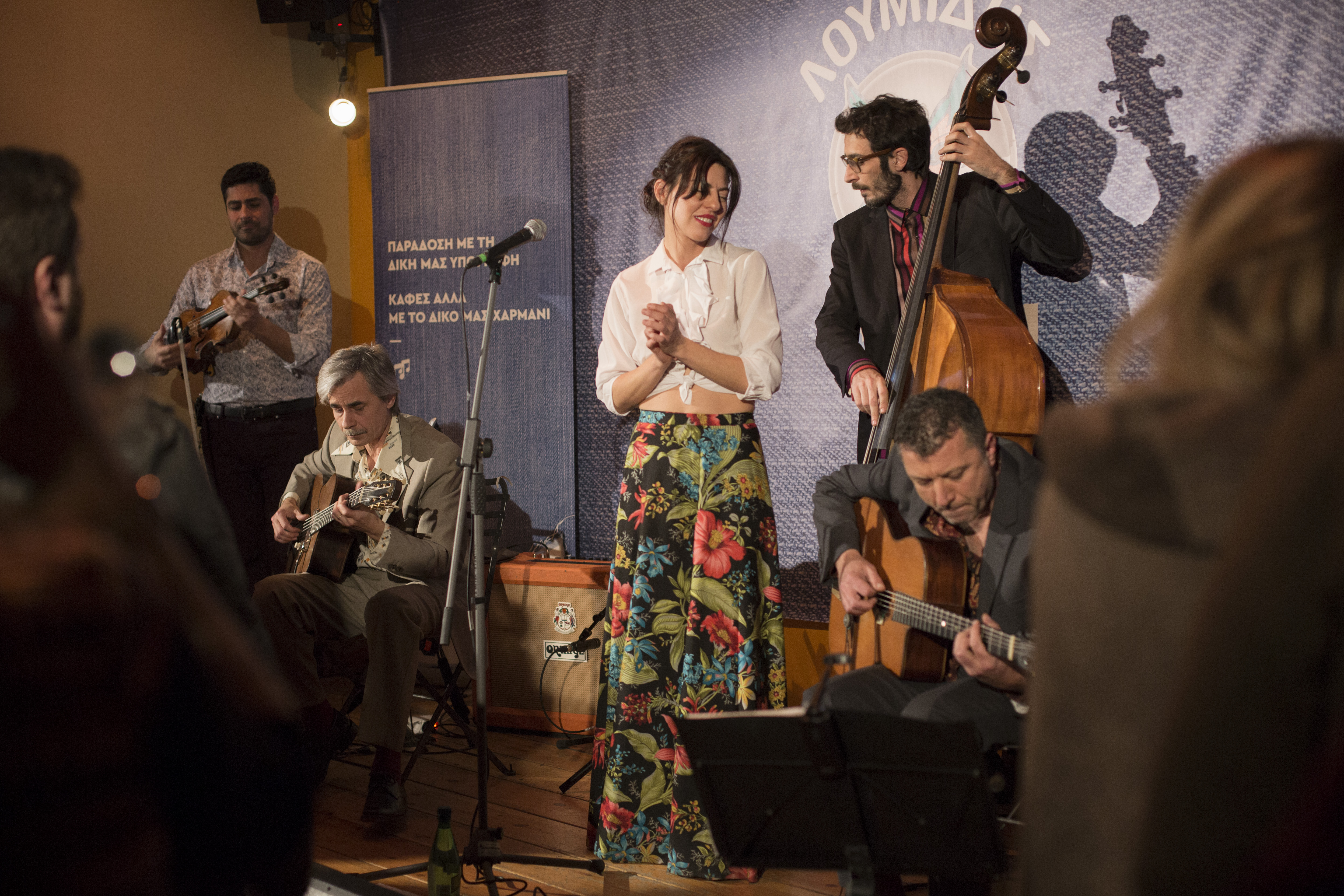 Τελικά ταιριάζει πολύ να πίνεις ζεστό, μοσχομυριστό ελληνικό καφέ και να ακούς το αγαπημένο σου συγκρότημα! Δημιουργεί μια αίσθηση ζεστασιάς και οικειότητας, όπως όταν βρίσκονται δύο φίλοι απ’ τα παλιά και τα λένε. Οι φίλοι μας σε αυτήν την περίπτωση ήταν οι Gadjo Dilo. Η Ηλιάνα Τσαπατσάρη, η φωνή του gipsy jazz συγκροτήματος, μας φώτιζε με το χαμόγελό της και το κέφι της.