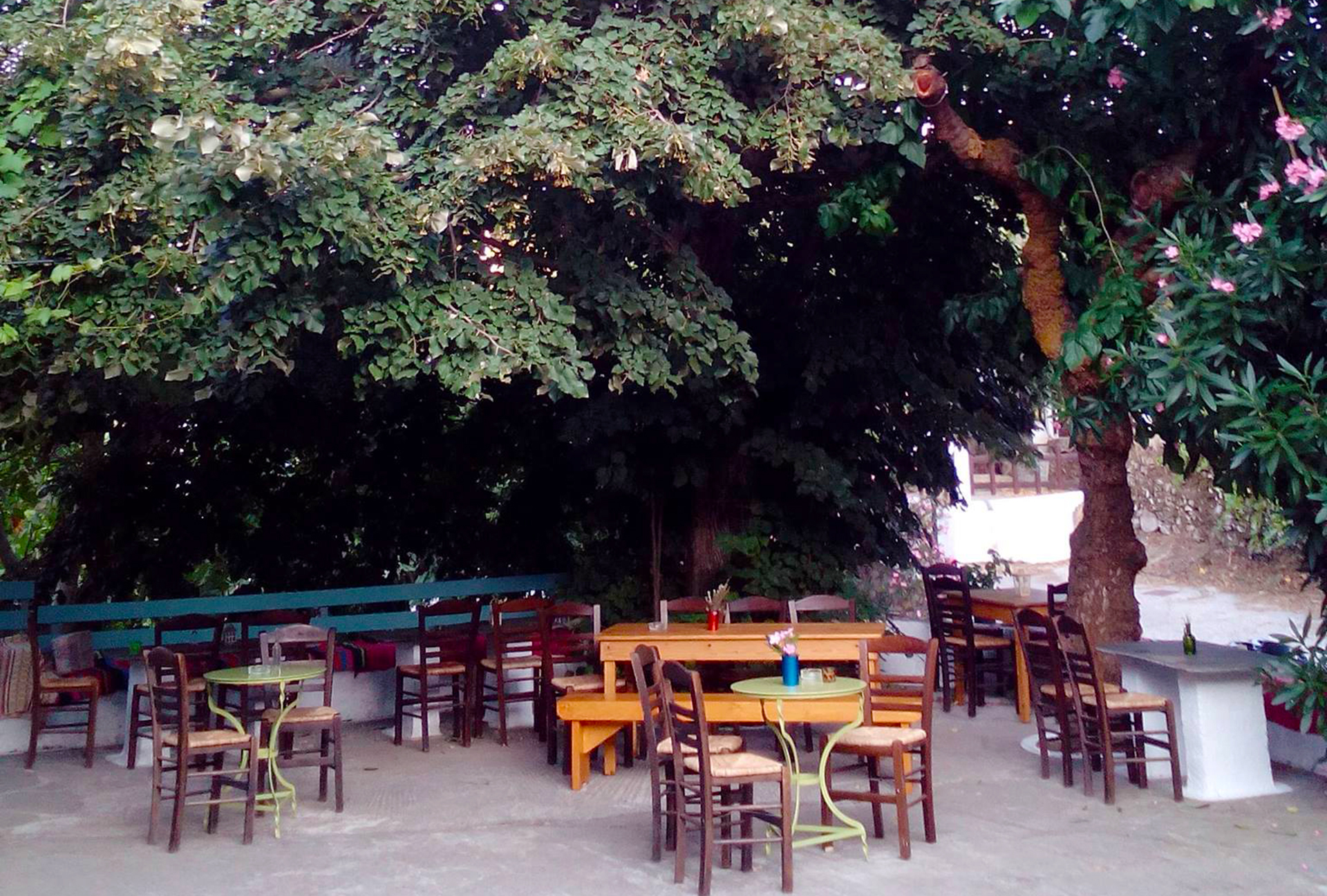 Θα τσουγκρίσετε τα ποτήρια σας με τα διπλανά τραπέζια, αφού, όταν αρχίσει να σουρουπώνει, η καταπράσινη αυλή γεμίζει με παρέες που κατά τη διάρκεια της νύχτας ενώνονται σε μία μεγάλη. Κάποια βράδια θα ακούσετε και ζωντανή μουσική και θα νιώσετε την πραγματική ξεγνοιασιά των καλοκαιρινών διακοπών, με τον τρόπο που μόνο οι Ικαριώτες ξέρουν.