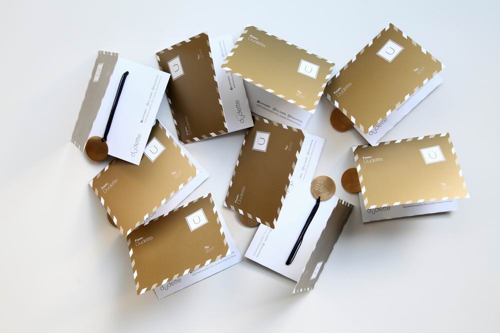 “Honey, this year i wish to have the greatest… Kiss!” διαβάζουμε στο γνωστό πλέον και αγαπημένο γράμμα της. Το περίτεχνο γράμμα που έχει δημιουργήσει για να μοιράσει ευχές και φιλιά, κρύβει μέσα του ένα κομψό μενταγιόν. Είναι επιχρυσωμένο και πάντα εναρμονισμένο στις αρχές του brand που έχει δημιουργήσει η Dudette. Απλό, λιτό, δωρικό!