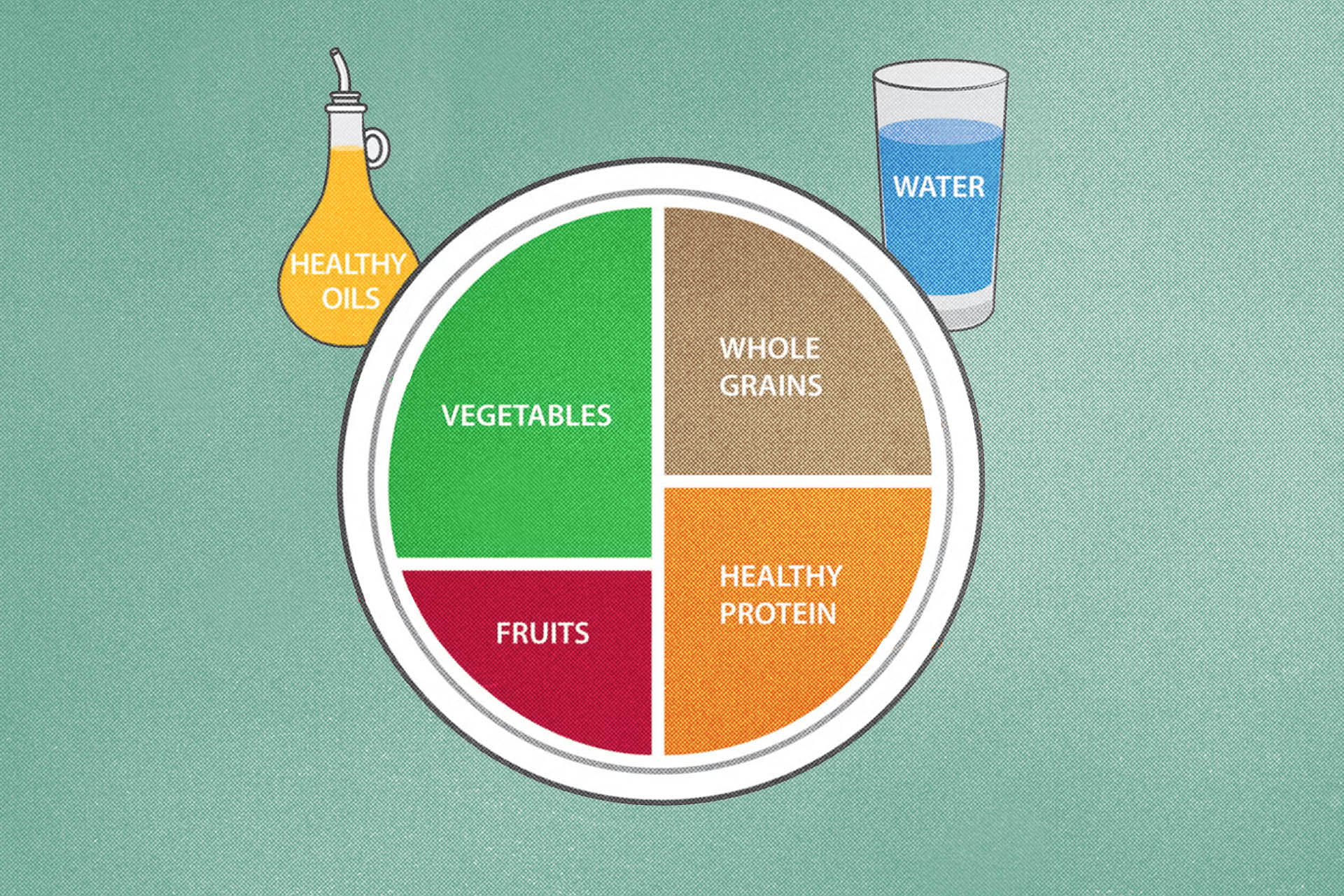Το «πιάτο» που σχεδίασε το Χάρβαρντ, λίγα χρόνια πριν, χωριζόταν στα τρία -όχι ίσα μεταξύ τους- μέρη: Στο μεγαλύτερο μέρος, στο μισό πιάτο δηλαδή, σερβίρονται φρούτα και λαχανικά ενώ το άλλο μισό πιάτο χωρίζεται στα δύο για να χωρέσει στο ένα τέταρτο δημητριακά ολικής άλεσης και στο υπόλοιπο πιάτο τροφές που αποτελούν καλές πηγές πρωτεΐνης.