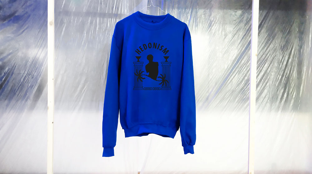 «Δεν πρόκειται για ένα υποτιθέμενο brotherhood ή κάποιο “we are” κίνημα. Δεν προσπαθούμε να δημιουργήσουμε κάποιου είδους cult ούτε να επαναπροσδιορίσουμε τίποτα». Το Hedonism ως στούντιο υπάρχει εδώ και μερικούς μήνες και ενδιαφέρεται για την εικαστική δημιουργία με την ευρεία έννοια, οπότε και κάθε πρακτική που συνδέεται με αυτήν. Μέχρι στιγμής δημιουργεί συνδυάζοντας το graphic design, την τέχνη και τη μόδα. Συγχρόνως, λειτουργεί ως πλατφόρμα ανταλλαγής ιδεών και συνεργασίας ανάμεσα σε σχεδιαστές και καλλιτέχνες που μοιράζονται κοινές αισθητικές αντιλήψεις.